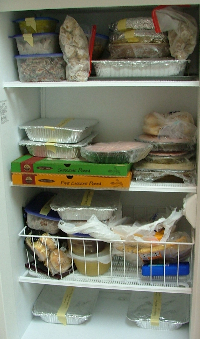 Also in that freezer are 2 emergency pizzas, shredded beef, 5 pans of pork ribs, chicken pot pie, chicken enchiladas, pot roast, cooked taco burger, grilled chicken wings, spinach lasagna, homemade meatballs, and various other meals I can’t remember preparing.
