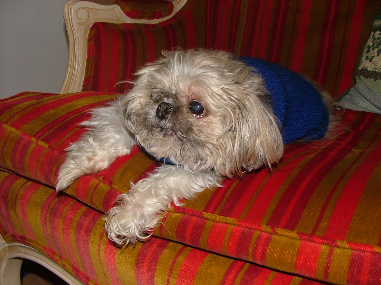 Banjo Man said he never was so glad to see the end of my red-and-gold-striped chair in his life, so last night while he was sleeping, I covered it up with a tablecloth so he could make the coffee this morning without the chair annoying him.  The day I found it, in the attic of a barn which was part of an antique store, Banjo Man did not appreciate its beauty.  He grumbled the entire time he tied it into the bed of my truck and, when we stopped for a sandwich and I worried that someone would steal it, he said, “I sure as hell hope so.”