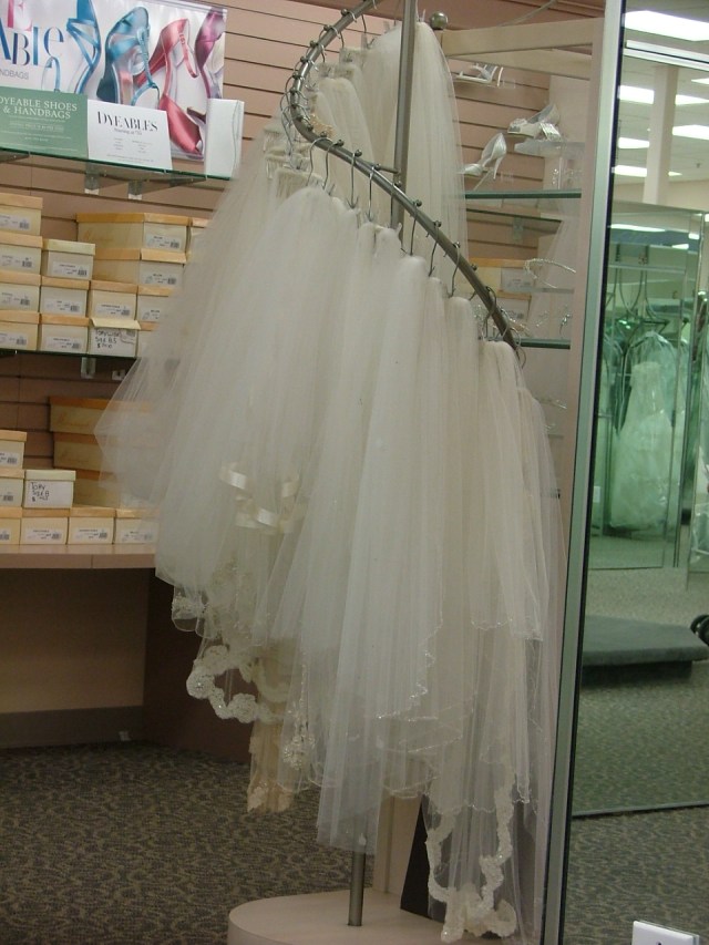 I can show you the display of veils. My bubble-cut Barbie didn’t have a veil for her wedding dress, so I put her petticoat on her head. Does anyone remember what a petticoat was?