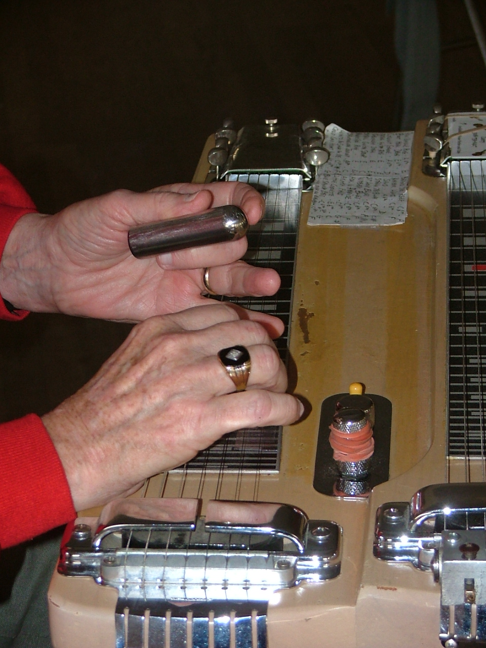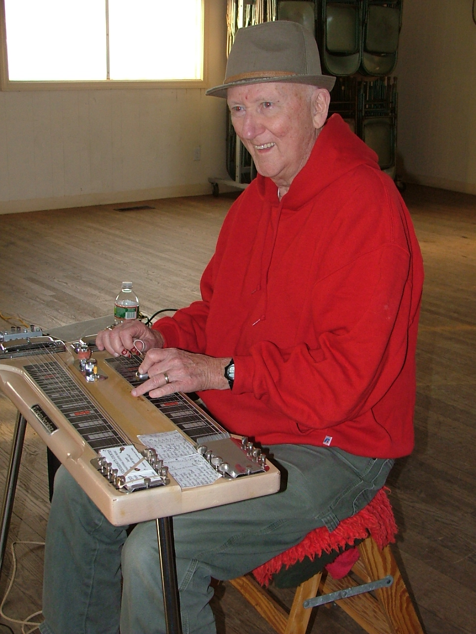 Joe Ferri, retired musician, took my hand and gave me some good advice:  Learn your scales, he said, and you can play any song with anyone.  Joe has played steel guitar with Kitty Wells, Hank Thompson and many other famous country folks.  He had to give it up three years ago, but everyone was really pleased he’d come to the meeting to visit a while.