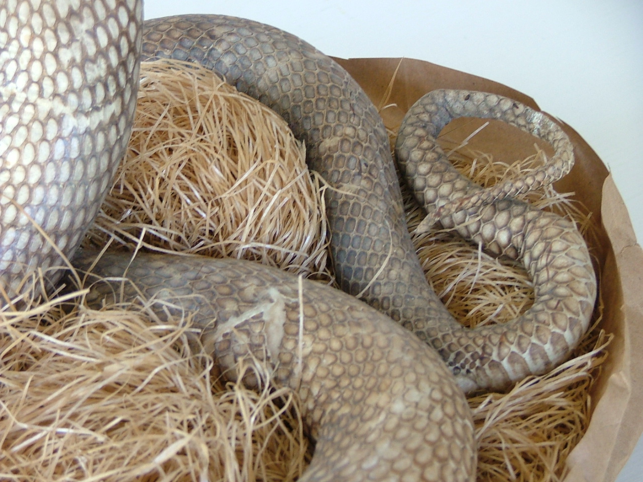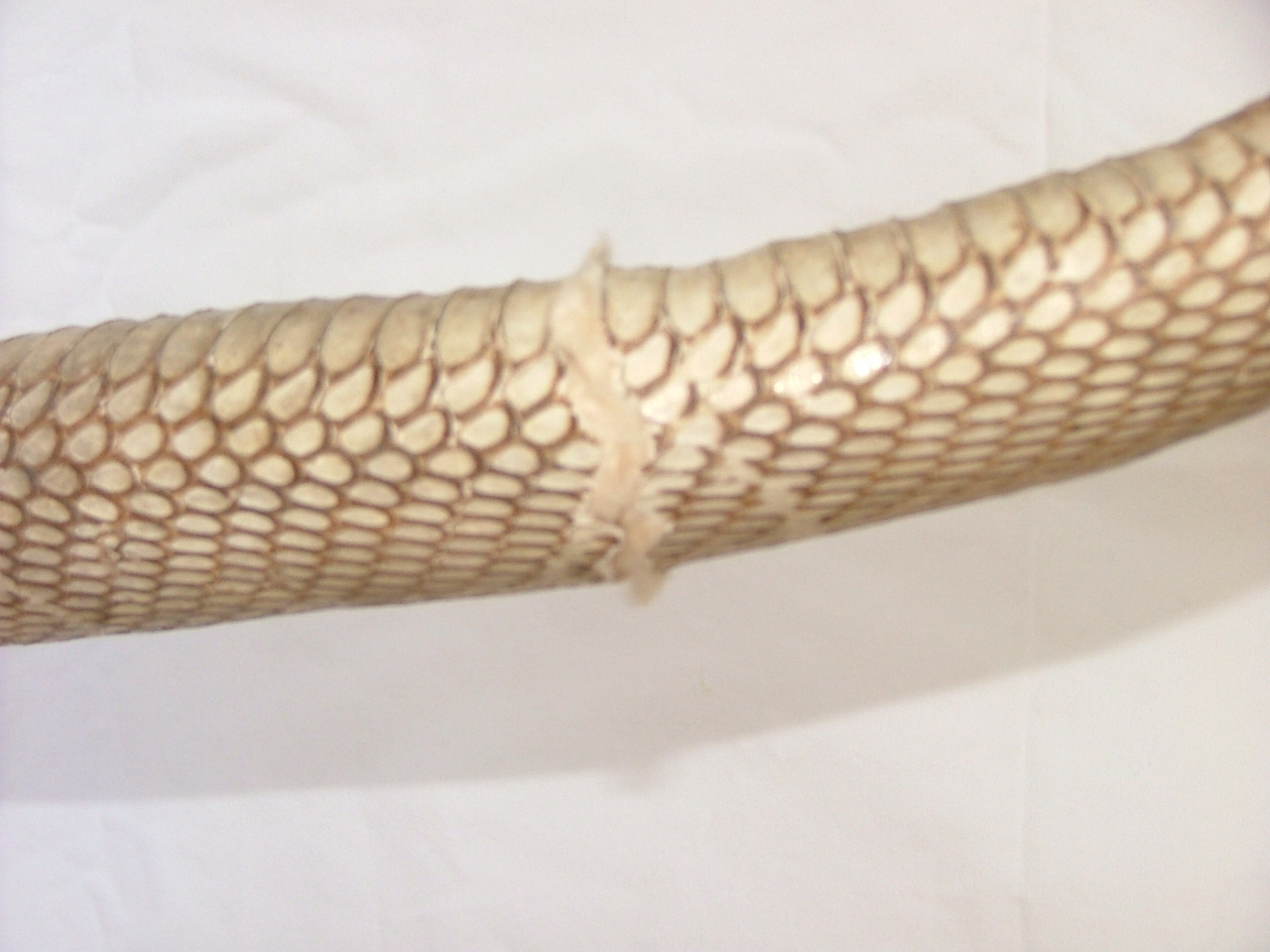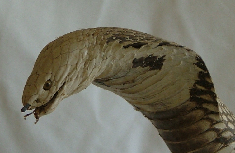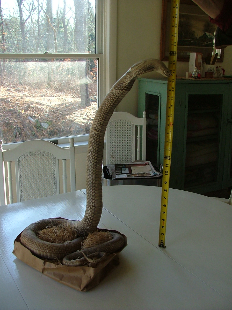 The cobra is spitting (which I suppose makes sense). It is/was about 6′ long. There is a crack in the neck which could be glued, I imagine, but gluing a snake neck is a bit low on my priority list right now. And if you wanted the skin, the glue would probably be in the way. It stands approximately 23″ high.