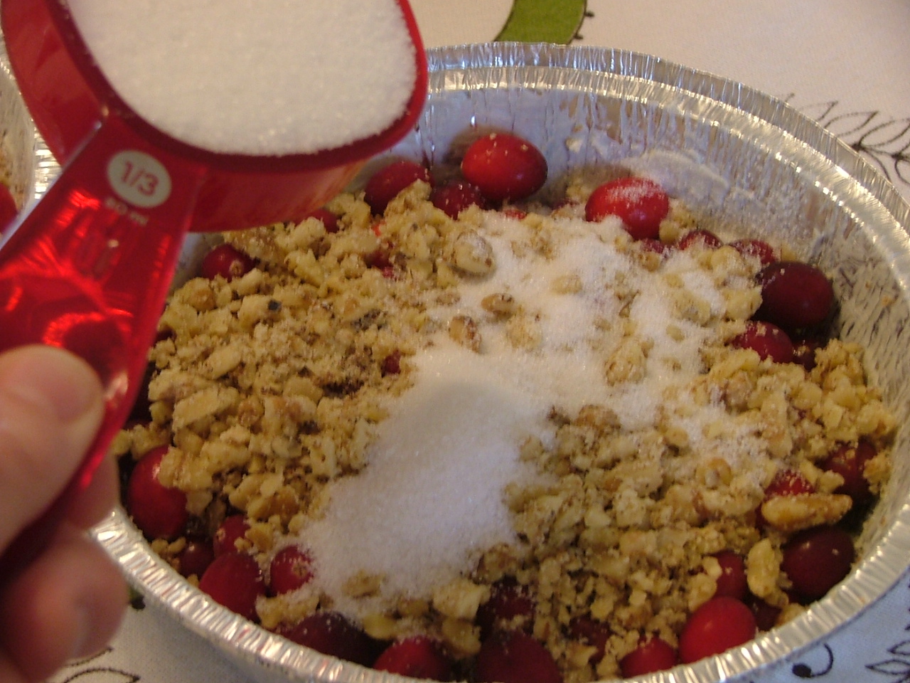 2.  Put the chopped cranberries and walnuts and 1/2 cup sugar in a buttered 10-inch pie plate or springform pan.