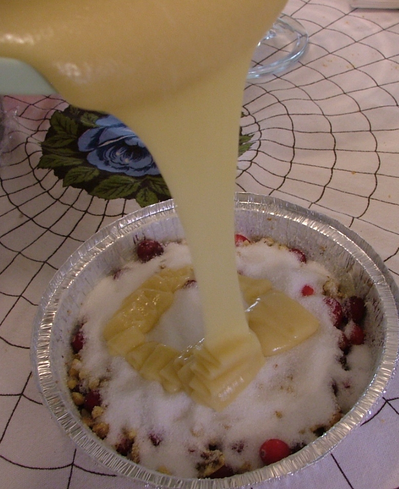 In an effort to find the true roots of this cake I looked in The Yankee Cook Book by Imogene Wolcott, a classic tome that contains just about everything anyone needs to know about traditional New England fare.  In the index was Cape Cod Cranberry Pie, but it turned out to be a real live pie.  Our Nantucket Cranberry Pie is definitely a cake;  furthermore, it is a snap to make, and, last but not least, it is delicious.  If you wanted to try your hand at lily-gilding, you might put vanilla ice-cream, creme fraiche, or (if you have tons of time) custard on the side, but my friend serves it straight, which is, I agree, the best way.