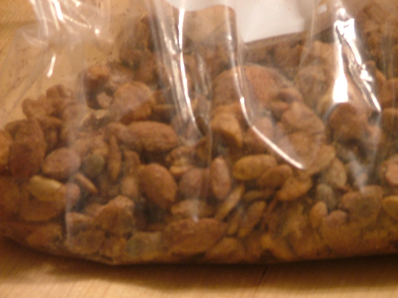 Banjo Man recently bought a ton of plain pumpkin seeds–he’d read they were a healthy snack–but I thought they tasted like soap chips and he wasn’t that crazy about them either. So for some weird reason he went out and bought more. I’m going to mix up the egg white/cinnamon/syrup/vanilla mixture and roast those pumpkin seeds tonight.