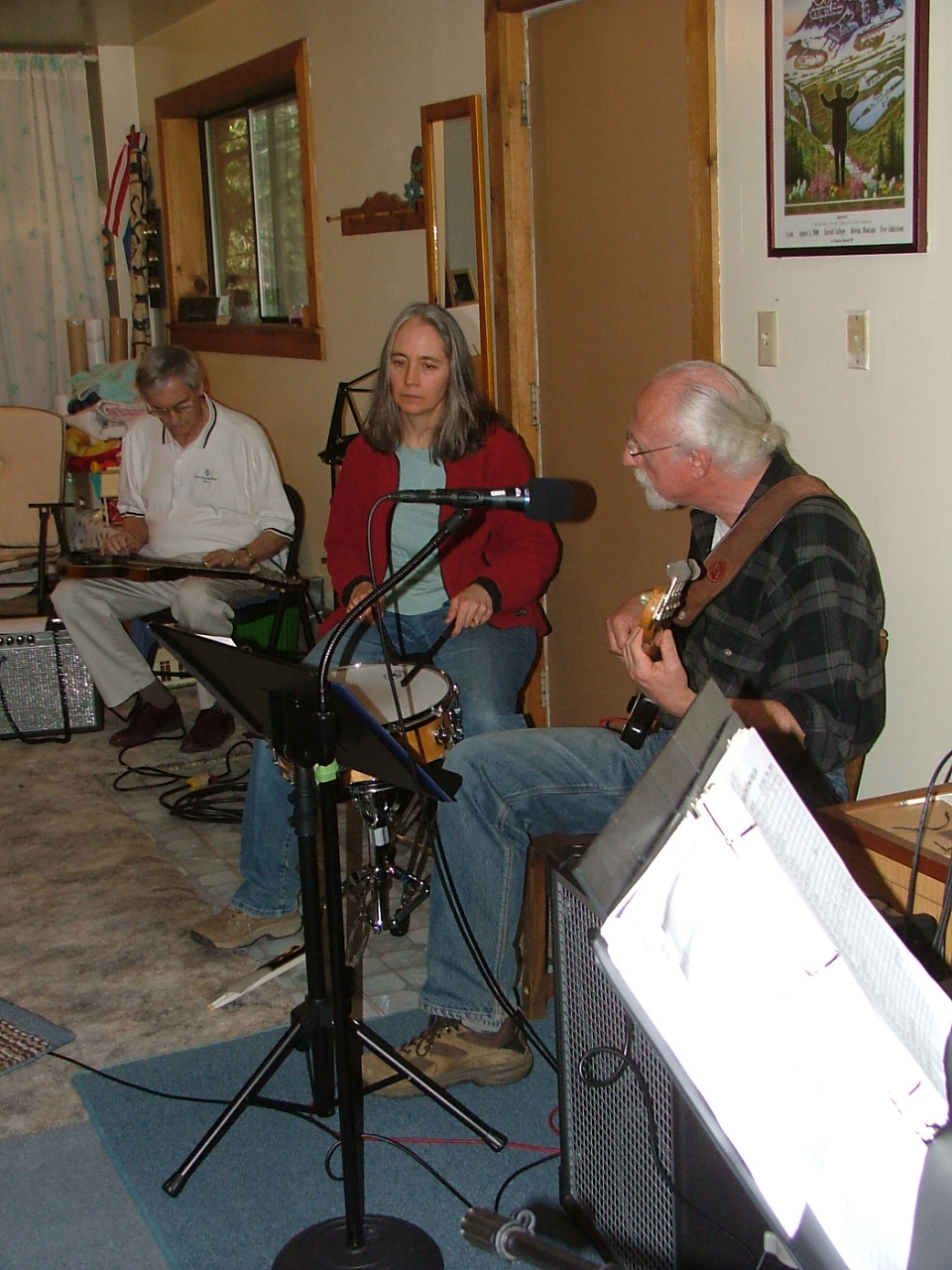 Banjo Man and I had heard about Sunday night band practices.  So twenty-one hours after we landed in Spokane, we (including Steel Guitar Man, also known as GL) were loading up our instruments and bowls of Black Bean Salad (with avocado lime dressing, recipe from Whole Foods, btw, but it really needs a lot more lime juice and cilantro) and music and microphone cord and amplifier and heading up the hill.