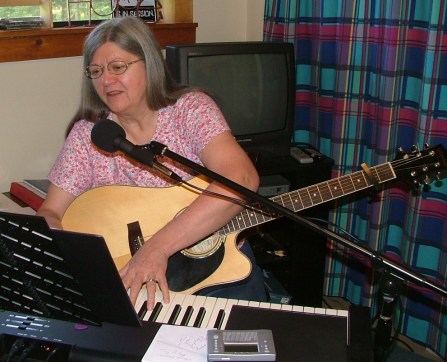 Retired Mountain Lady, our fearless leader, is multi-tasking here. She can play the guitar and the keyboard at the same time!! Now all she needs is one of those foot drums.