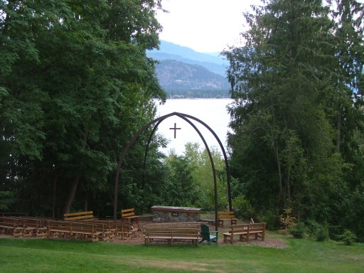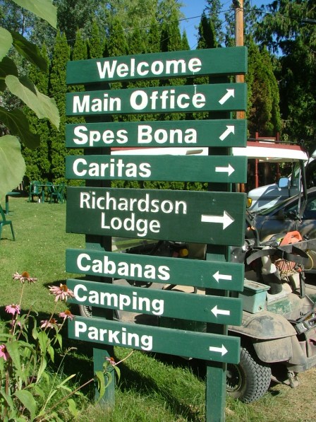Our new home for the next six days! The banjo case should have been a clue of what was to come, but on Saturday I was totally oblivious. The room was perfect, set up dorm-style with twin beds and a tiny bathroom. Our window looked out to the outdoor chapel and the picnic tables where we would eat our meals.
