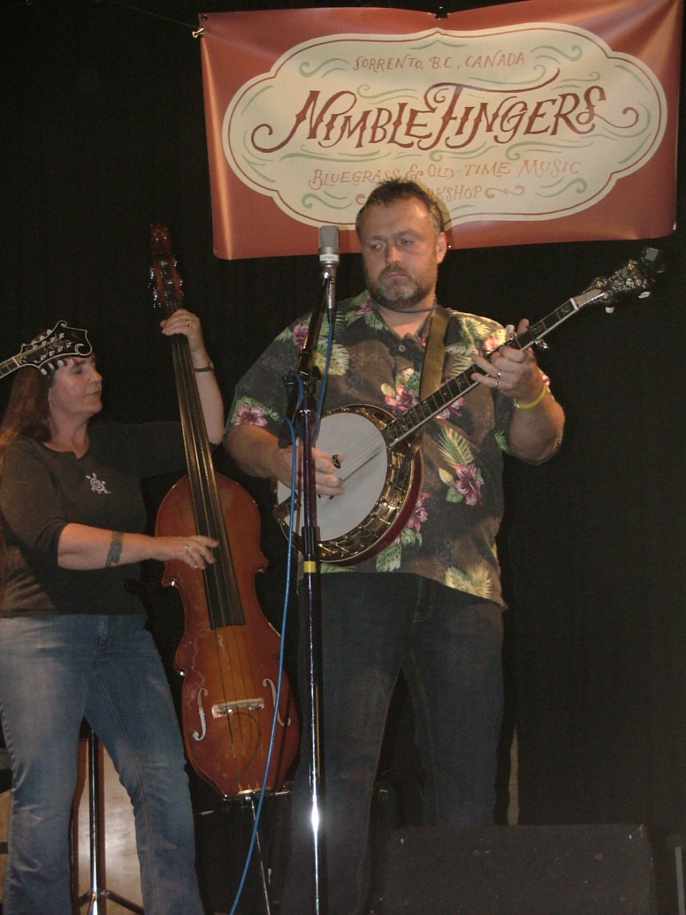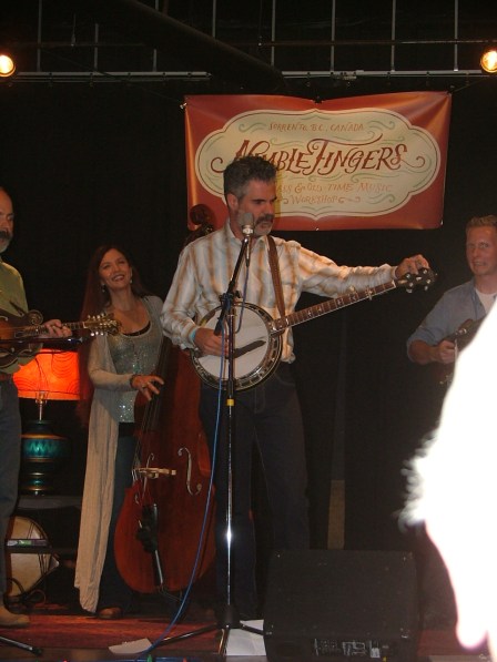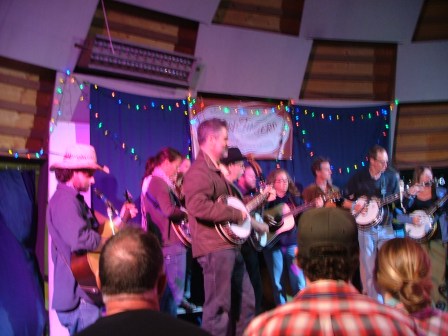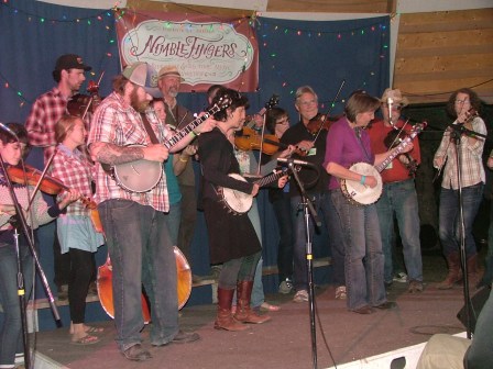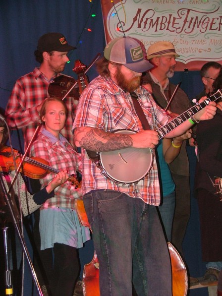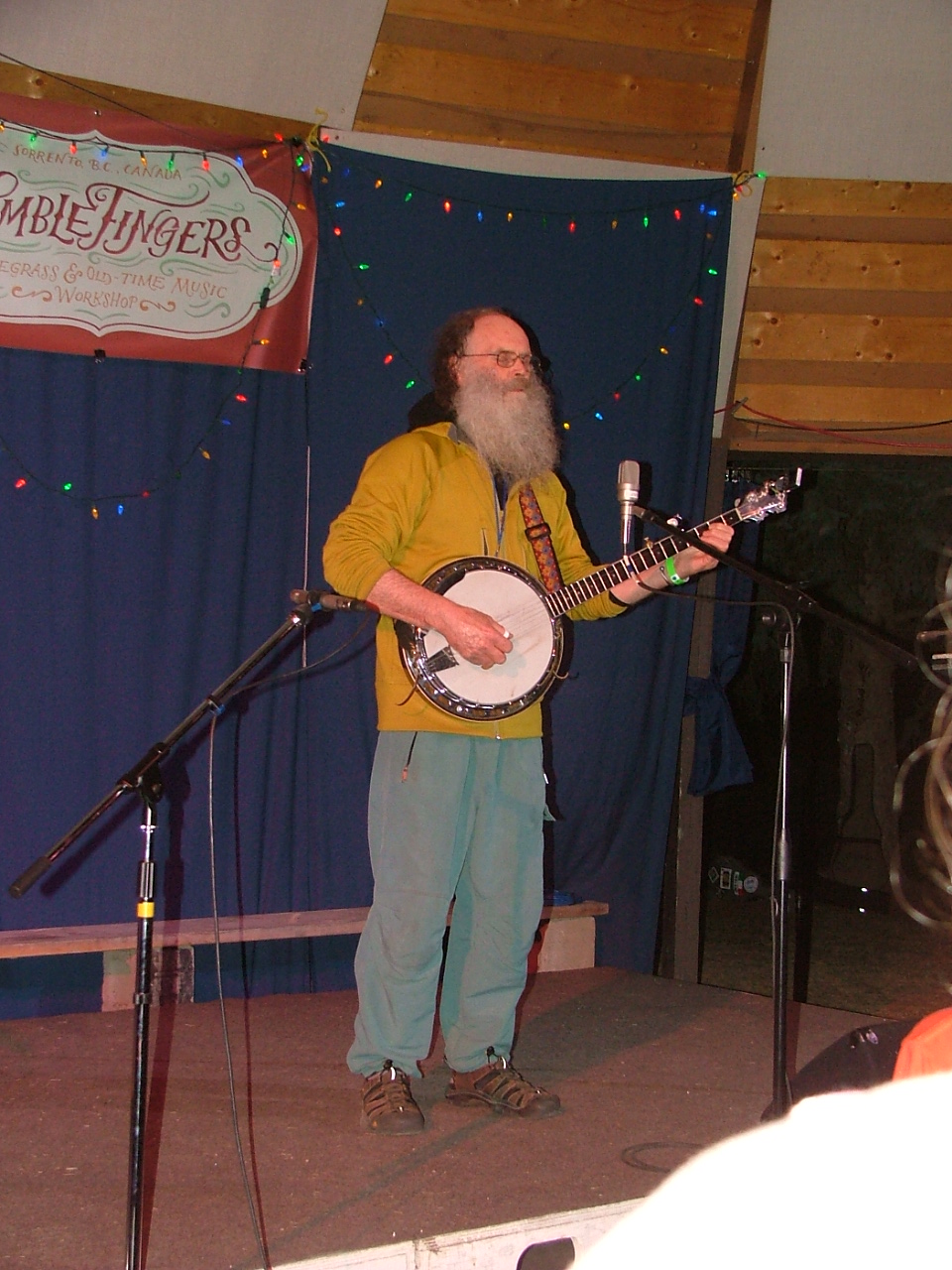 I later counted the number of students in the five banjo classes: 35. There were teachers, which brought the count to 40. Plus others who simply brought along their banjos and took classes in dobro or guitar or singing. I’m guessing there were easily 55 banjo players bouncing and twitching and plucking around camp.
