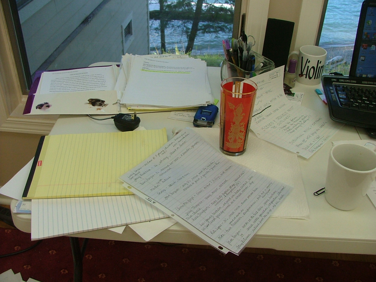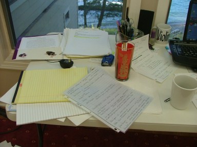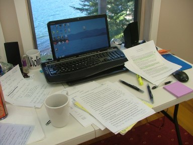 I’m buried in my office. Here’s what a book-in-progress looks like on an organized day: