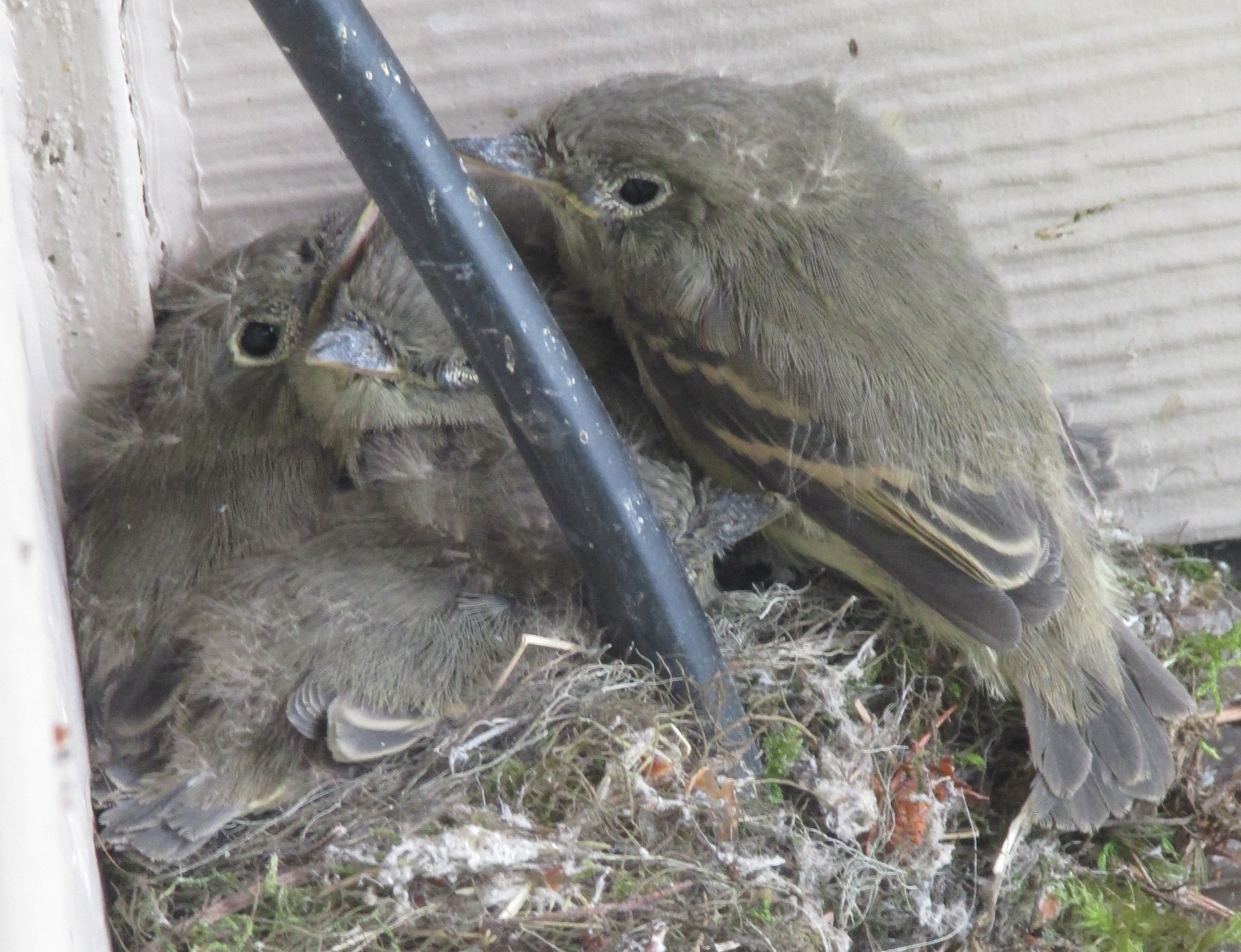 Do you know what kind of birds these are? The babies are getting bigger and here is Mama hanging on to the outside of the nest. We’re expecting thunderstorms, so she’s ready to keep the little ones safe from wind and rain.
