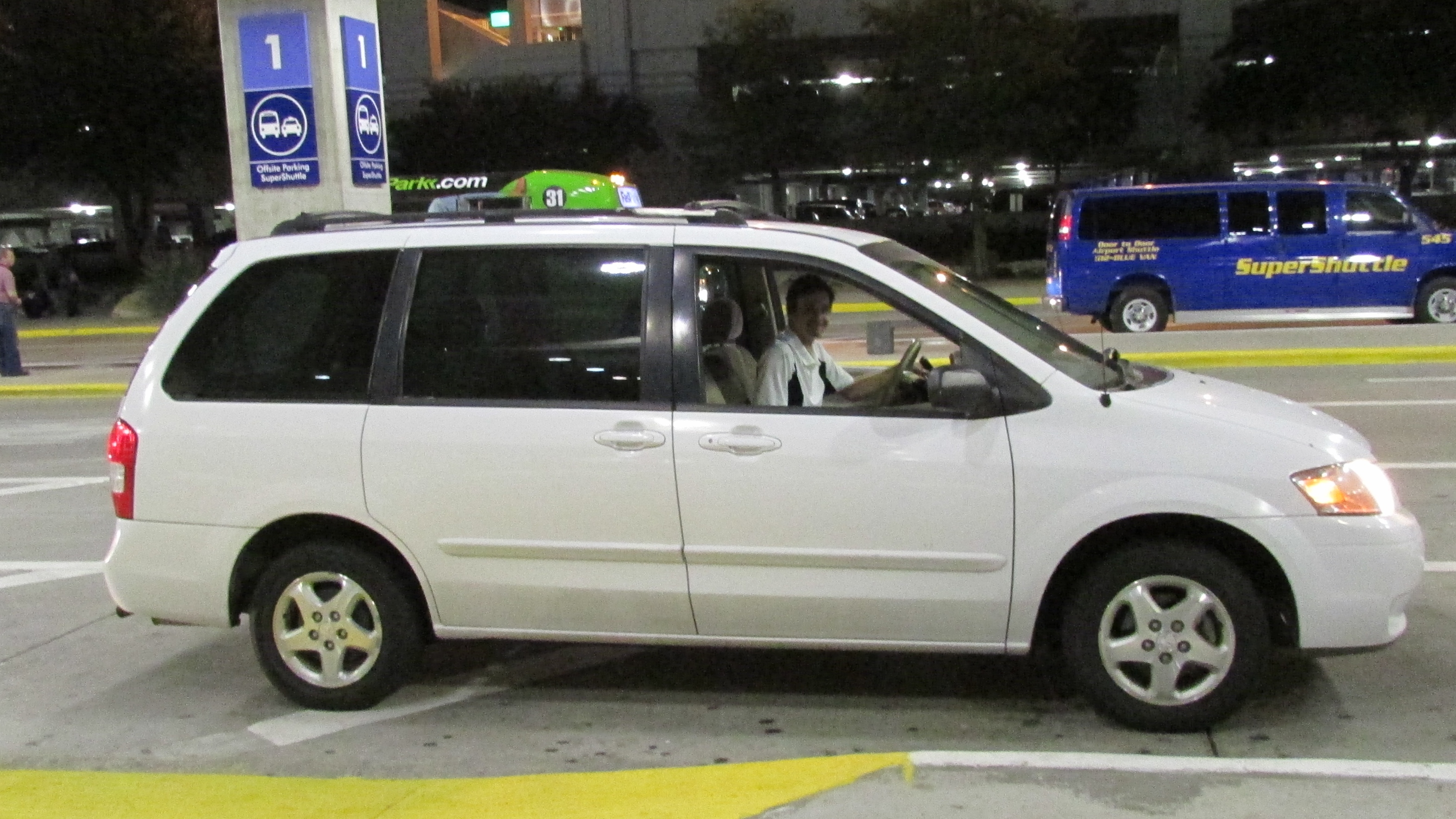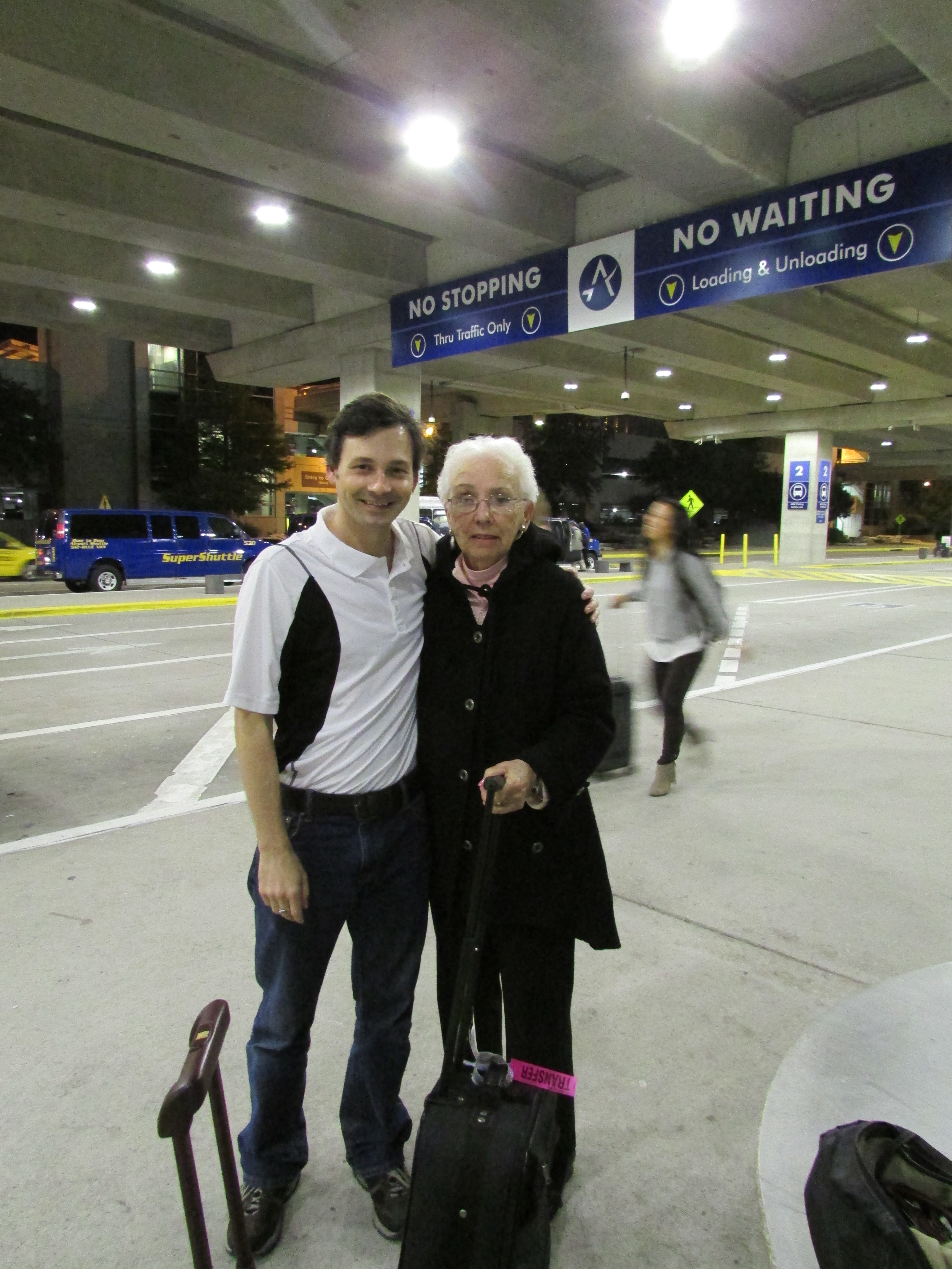 Mom has a Dunkin Donut croissant sandwich while waiting for the plane.