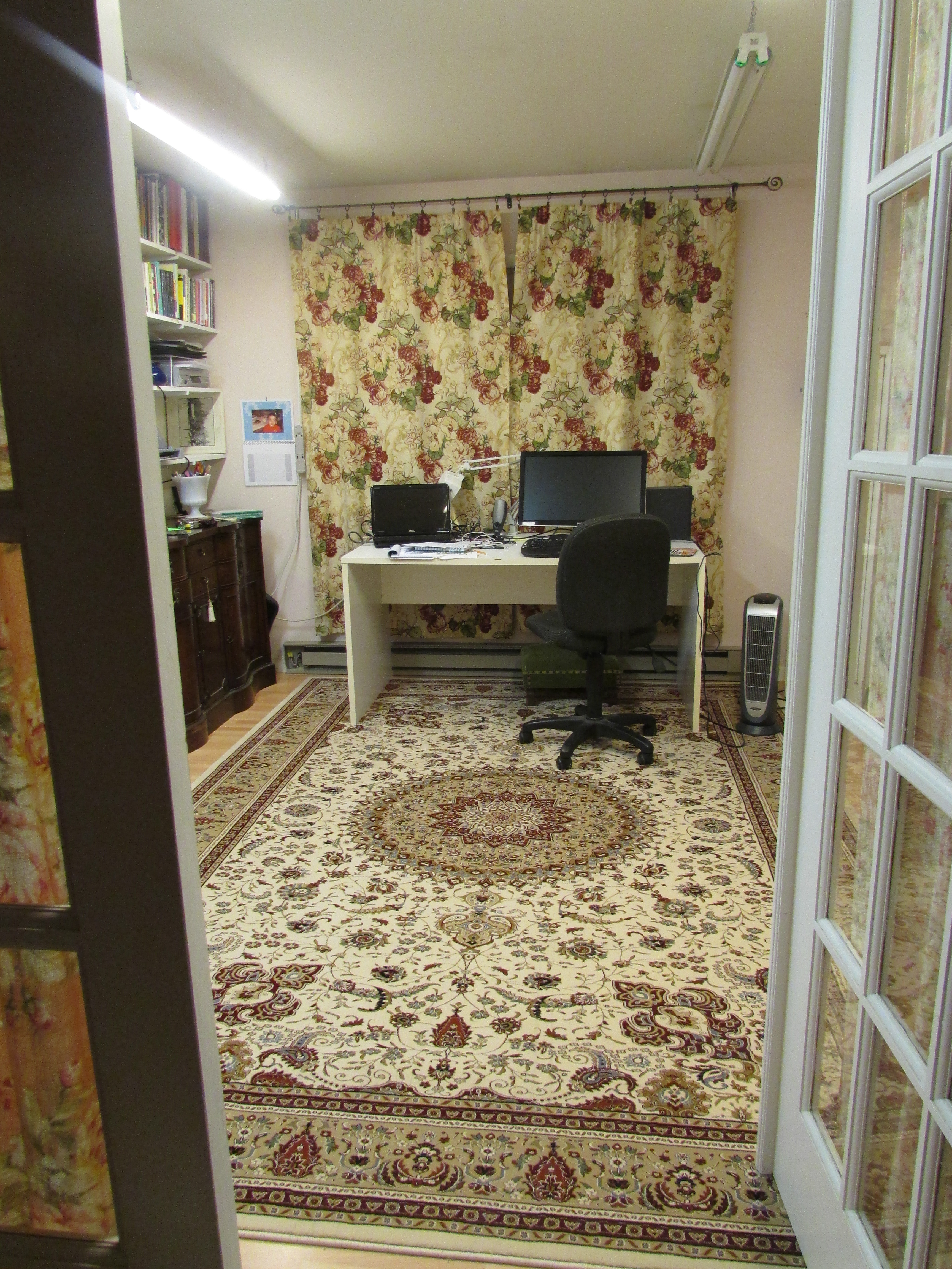 My office has been a maze of desks, folding tables, rolling tables, odd bookcases, secondhand chairs, ironing board, sewing tables, etc. for many, many years. Just walking into it has been depressing, no matter how much I clean and organize, no matter how many books I got rid of, no matter how pretty storage boxes I bought. There simply wasn’t enough room for writing, sewing and music.