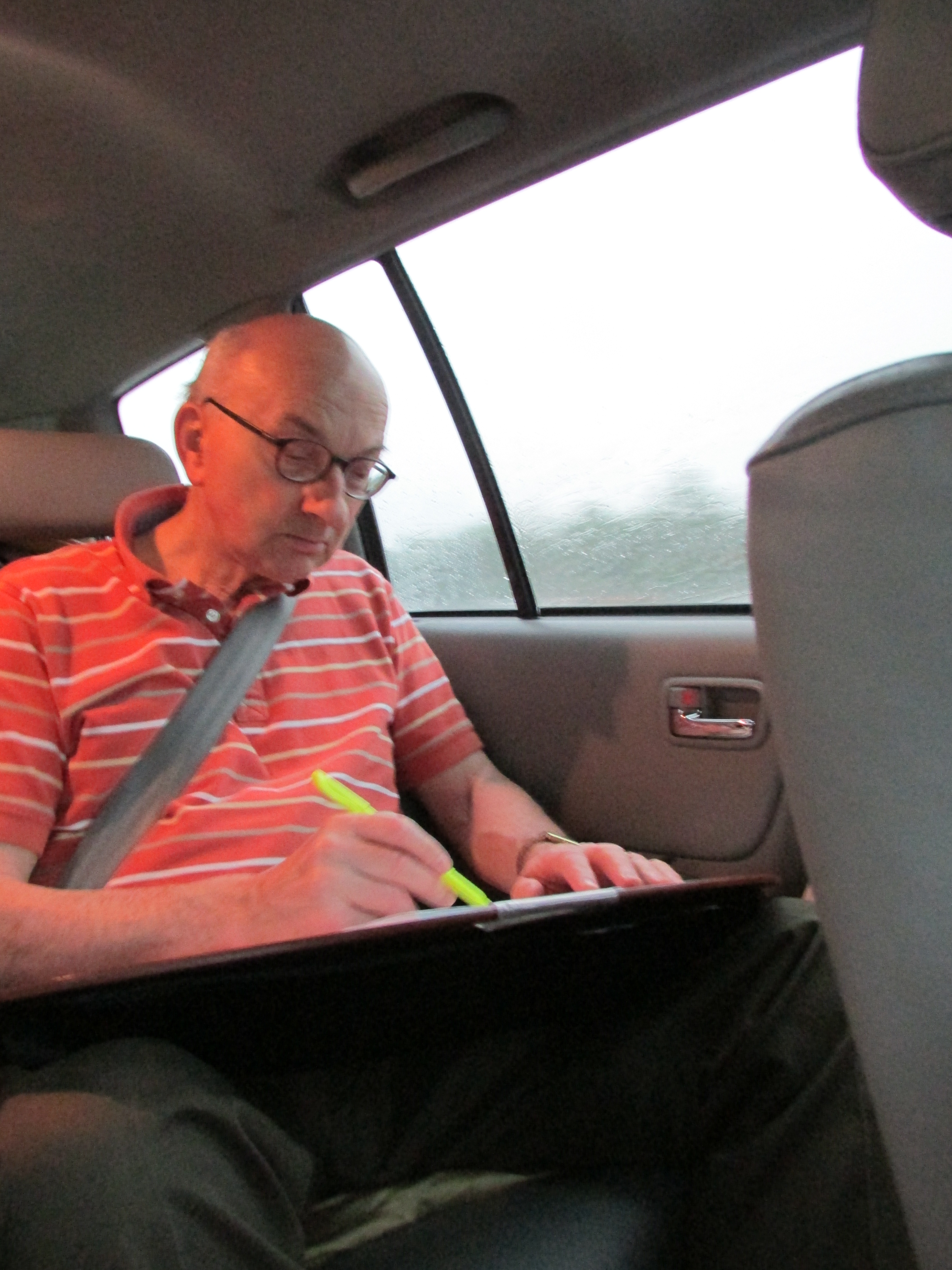 Banjo Man returned to the back seat, where he had set up an office and study area.
