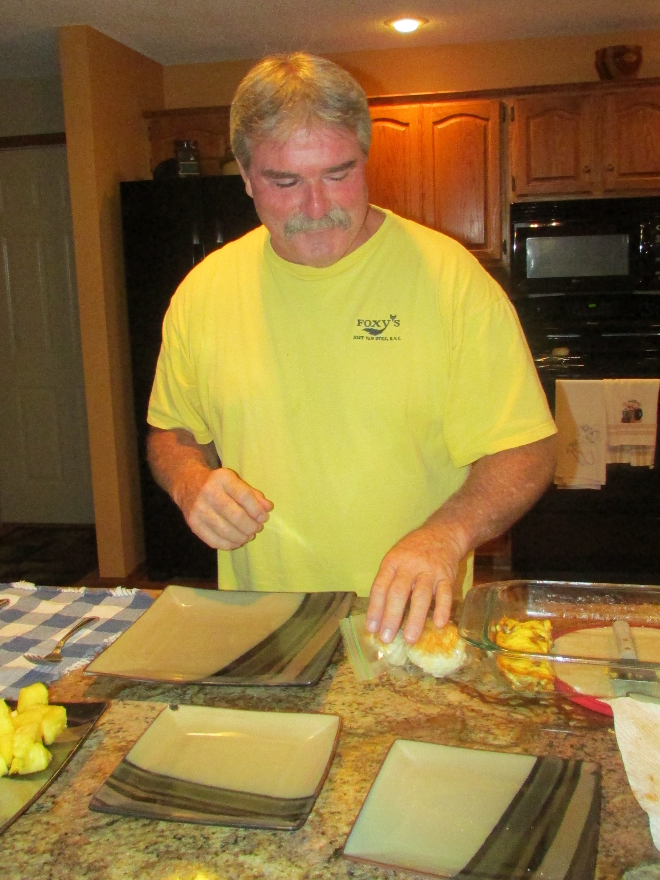Here is Nebraska Jack fixing his every-Sunday-at-8 AM-breakfast. We love his food. And he looks good in yellow.