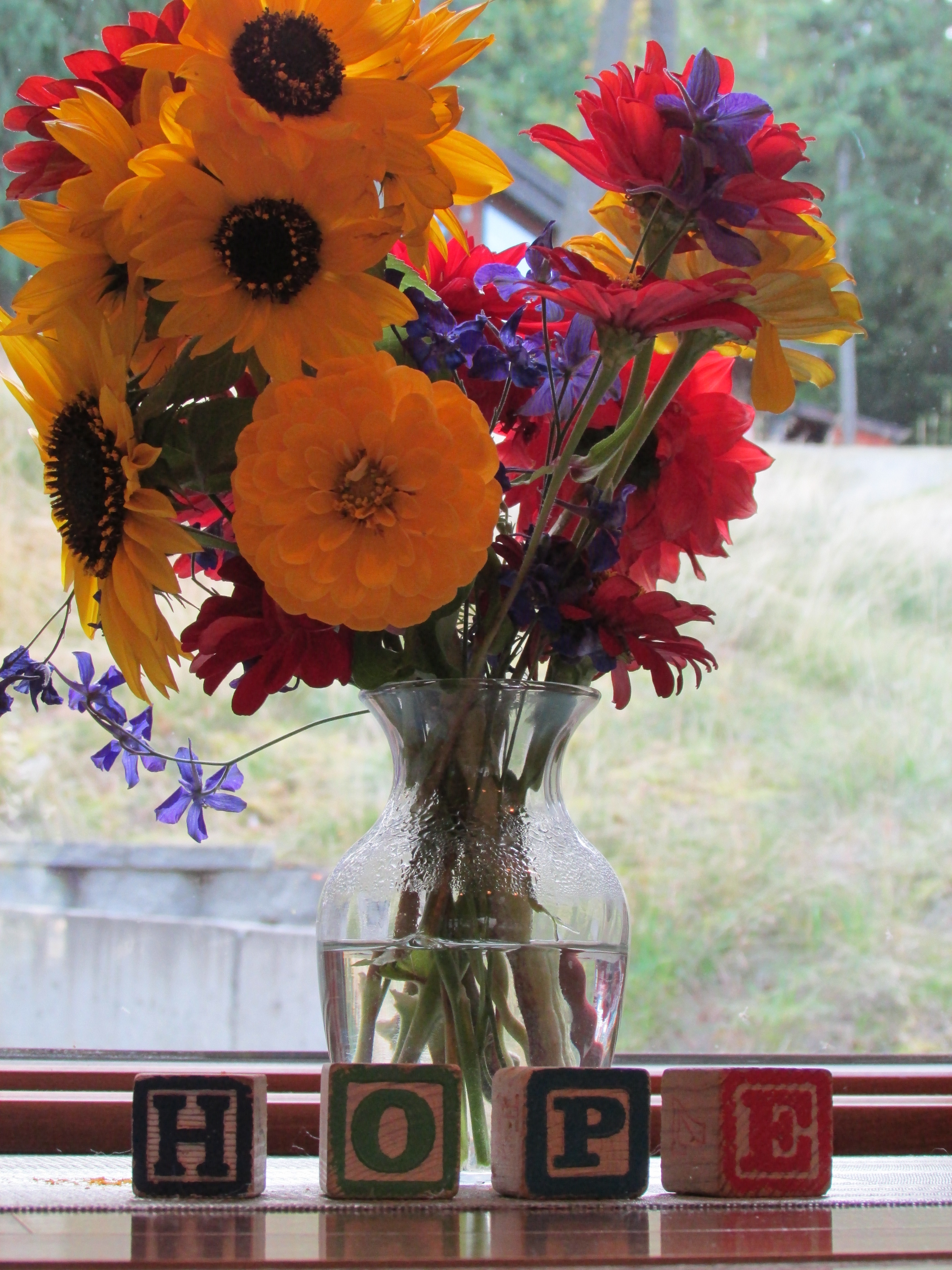 - Flowers from Dancing Mandolin Player’s garden, and vintage blocks from a local antique store.