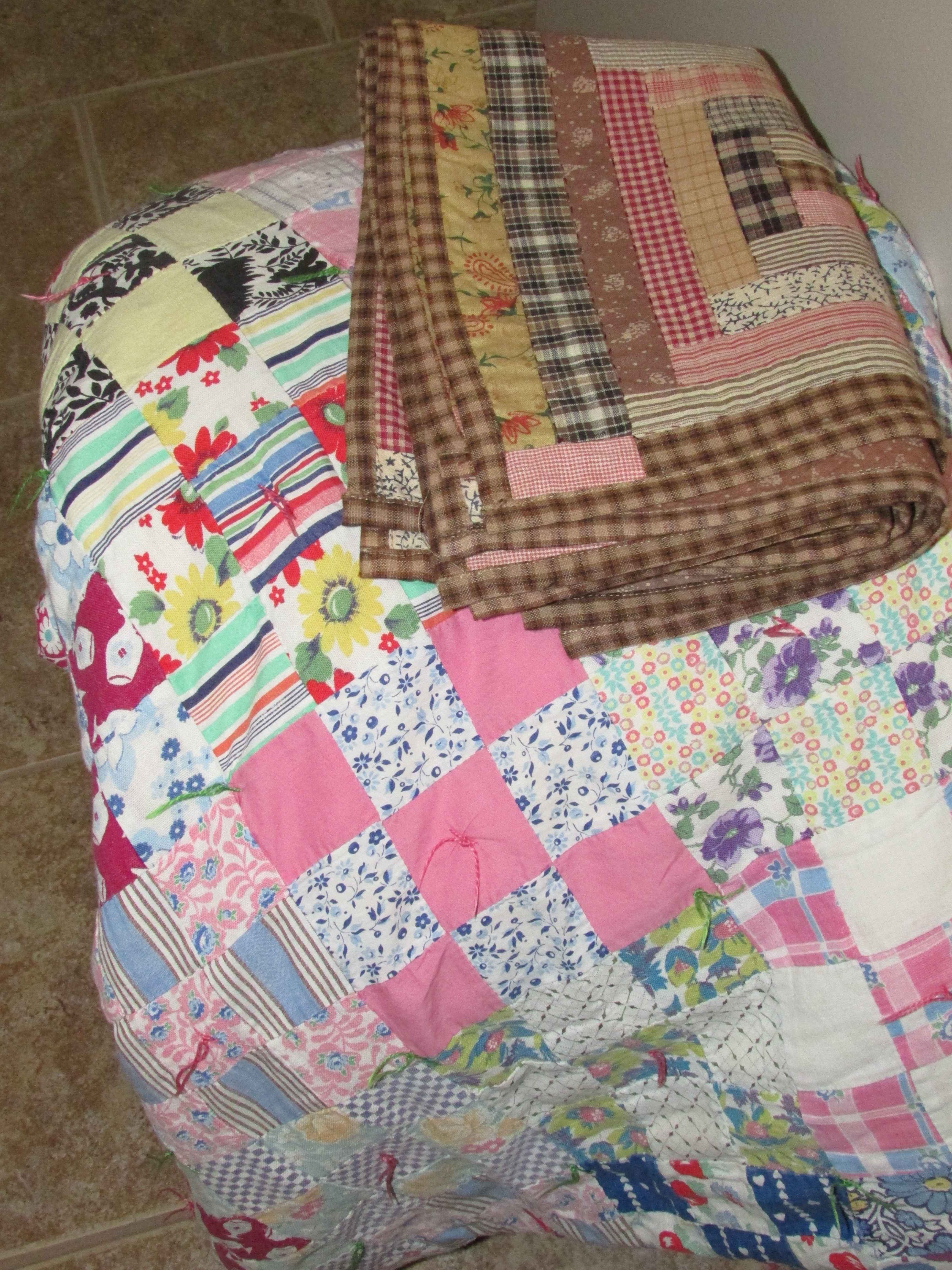 Some goodies from the Community Center Tailgate Sale waiting to be washed. Check out the array of vintage fabrics in those little blocks! I love looking at them.