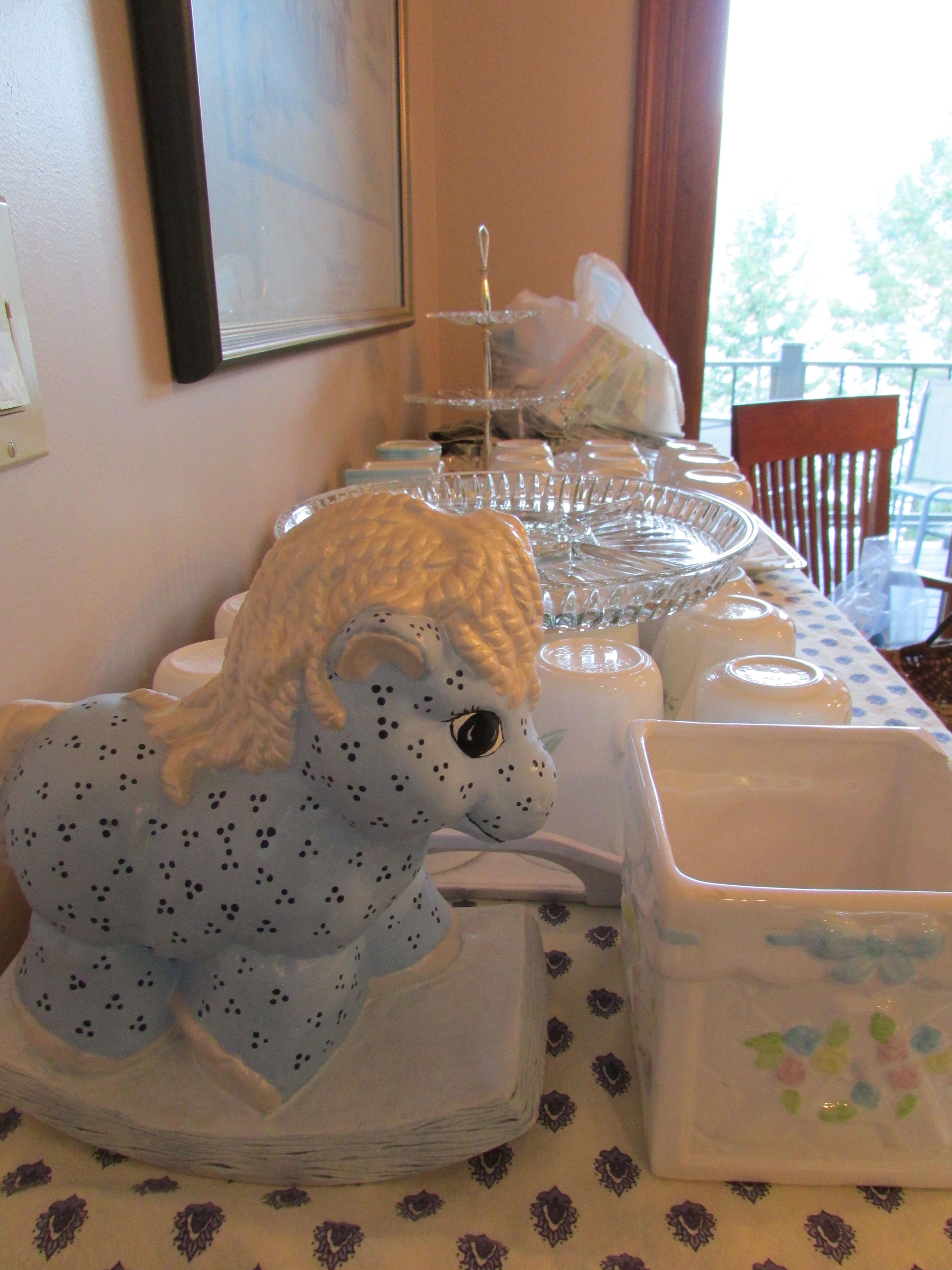 Treasures lined up, as I get ready to host a baby shower. My French Friend Janou is FINALLY going to be a grandmother.