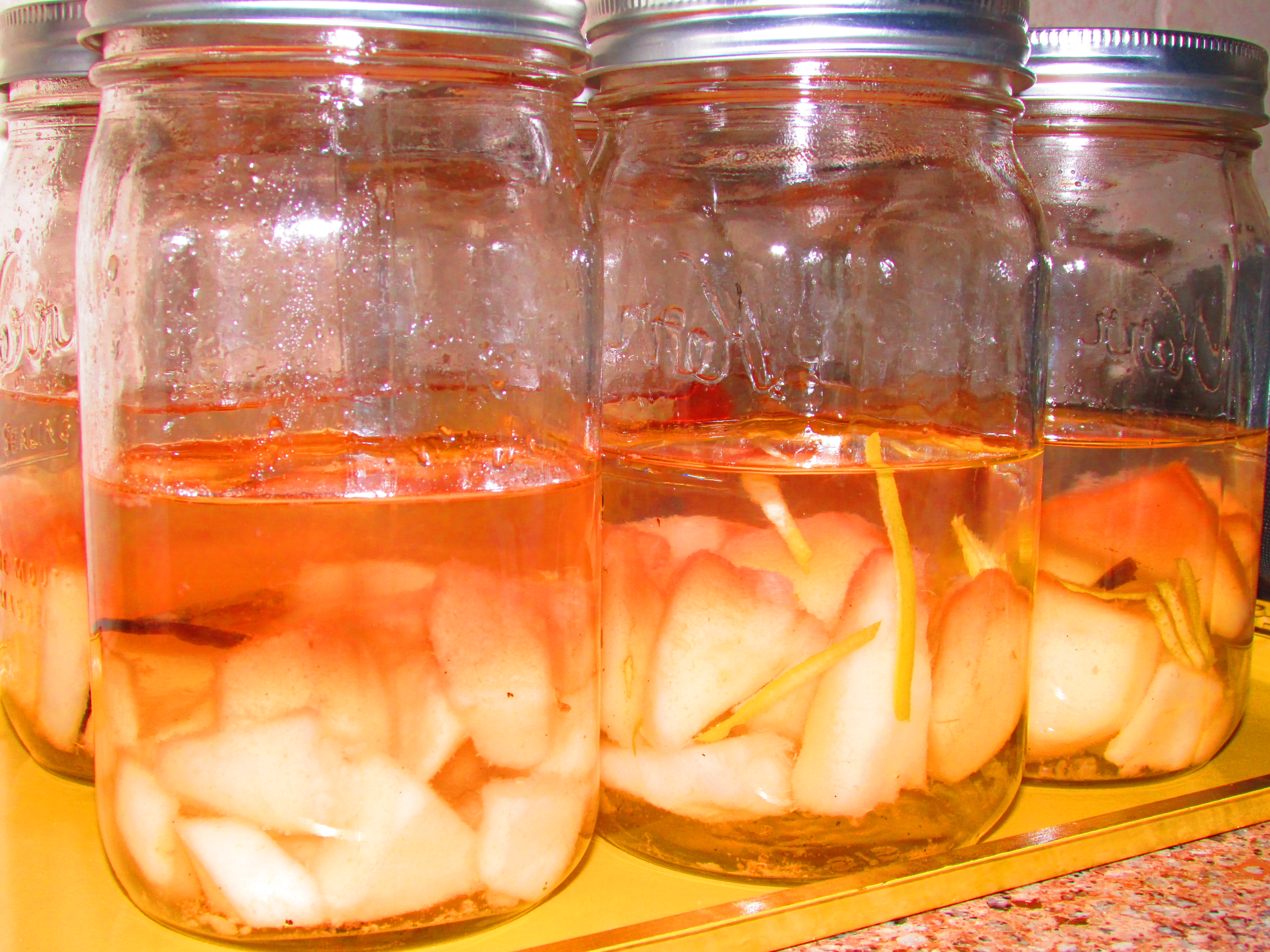 What you see are peeled, cut up pears soaking in vodka.  Two jars have vanilla beans, two jars have vanilla beans and cinnamon sticks and two jars have vanilla beans and the zest of Mayer lemons.