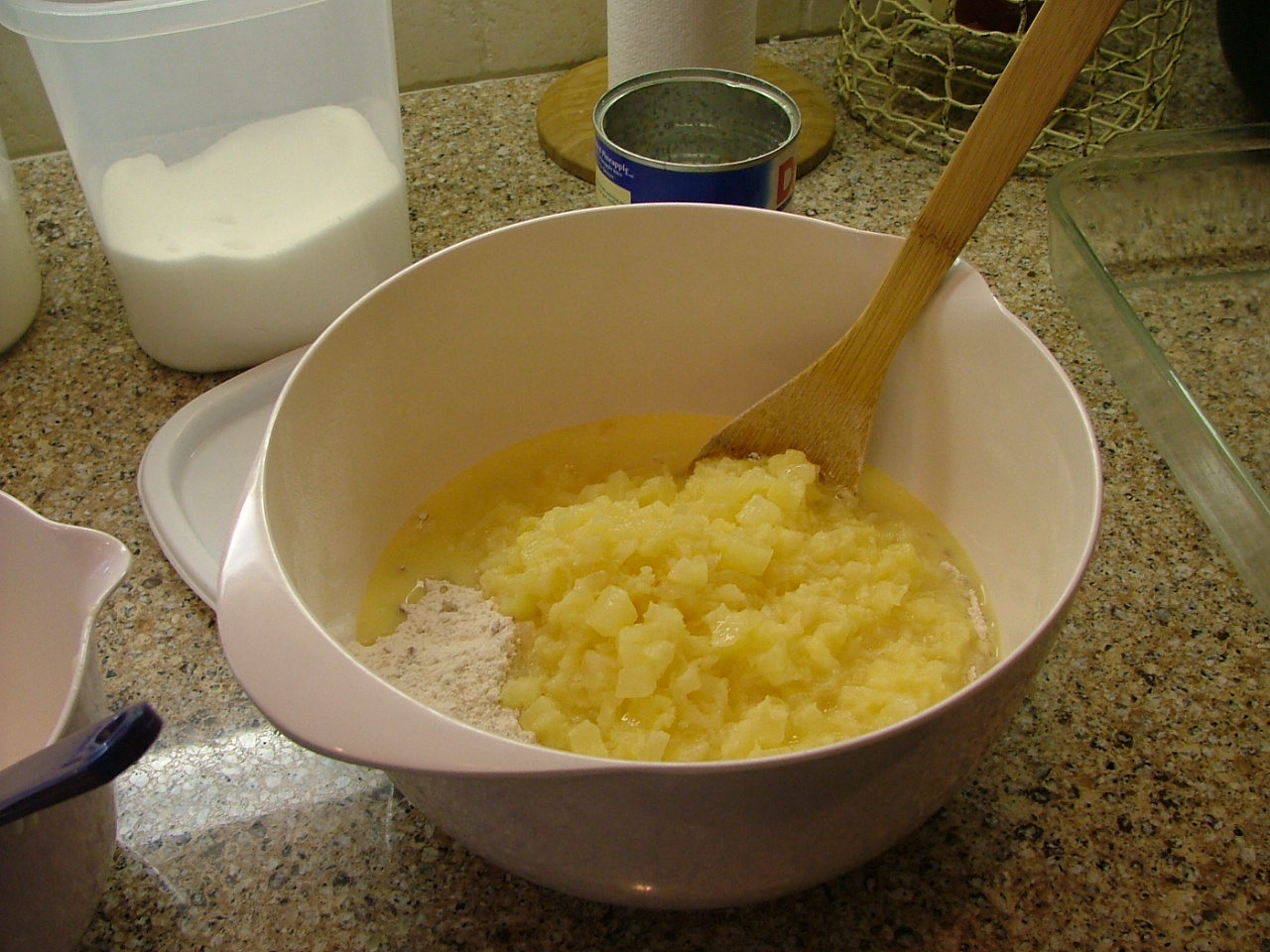 Combine the eggs with the pineapple and add to dry ingredients. Mix, then pour into a greased 9”x13” pan. Bake at 350 for 35-40 minutes.