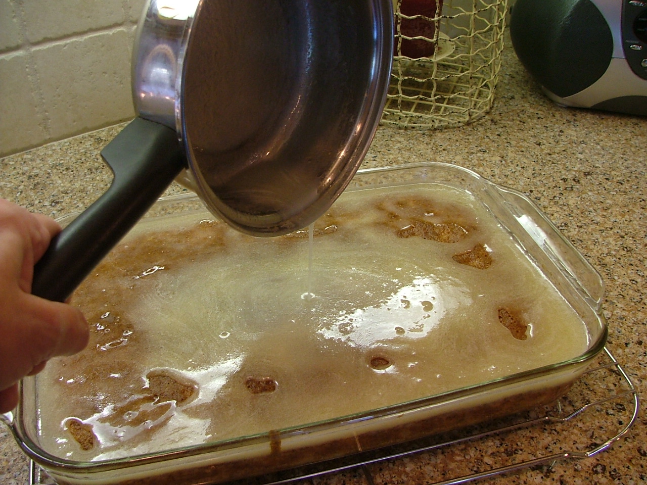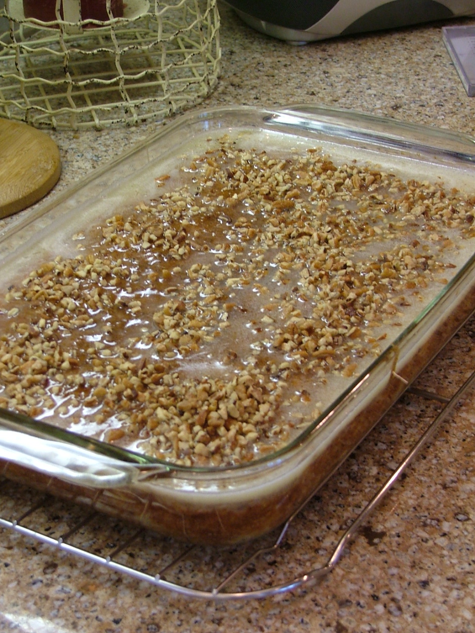 Make the icing by heating the butter, milk and sugar until sugar has dissolved. When cake is baked, put it on a rack and while it is still warm pour the icing over it. Sprinkle the top with either nuts or coconut.