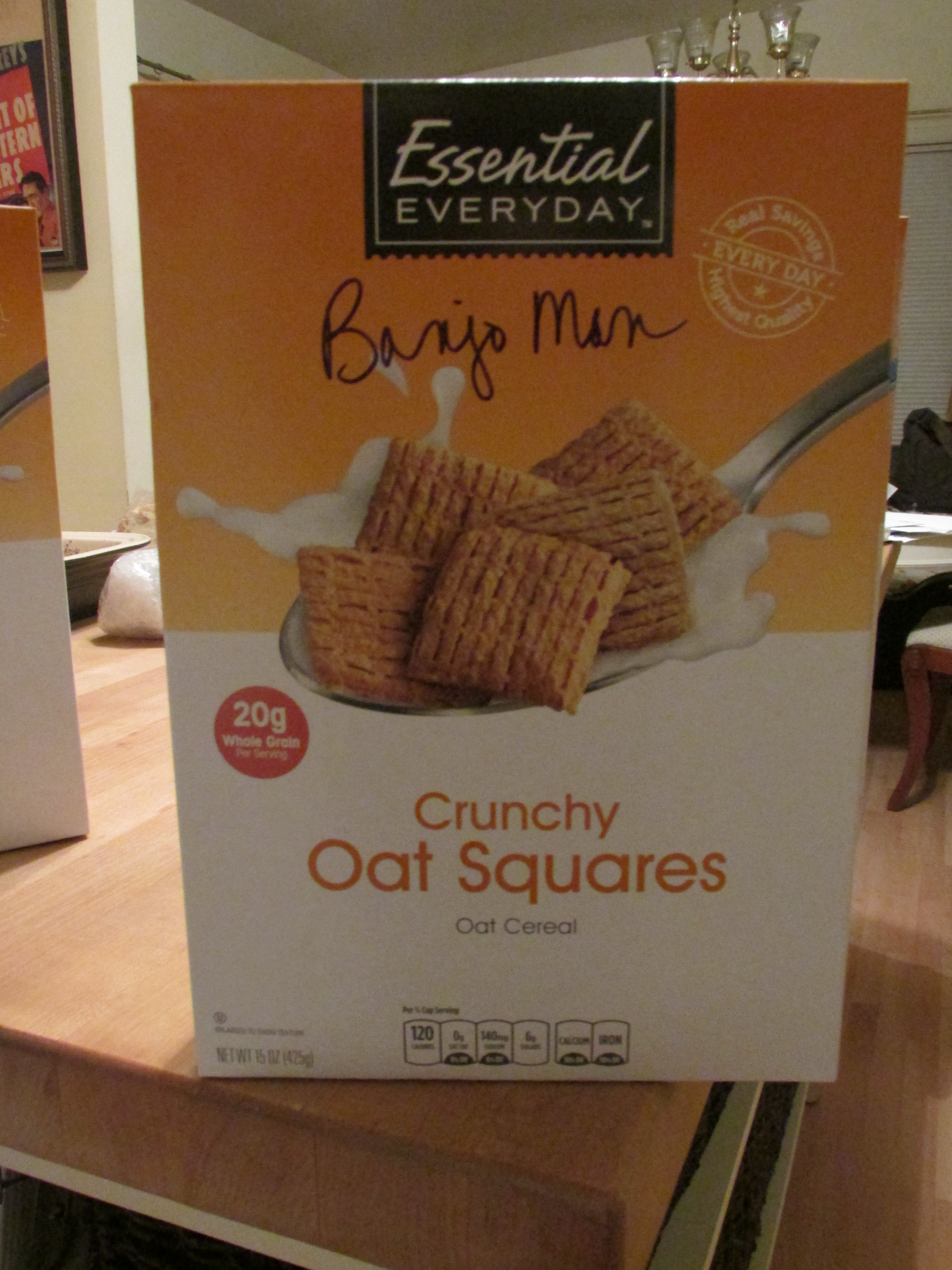 The next day I went downstairs to Banjo Man’s office to ask him something and I saw the box of Oat Chex.  Banjo Man had eaten the rest of the cereal.  He’d sneaked the box downstairs and finished it off while I wasn’t looking.