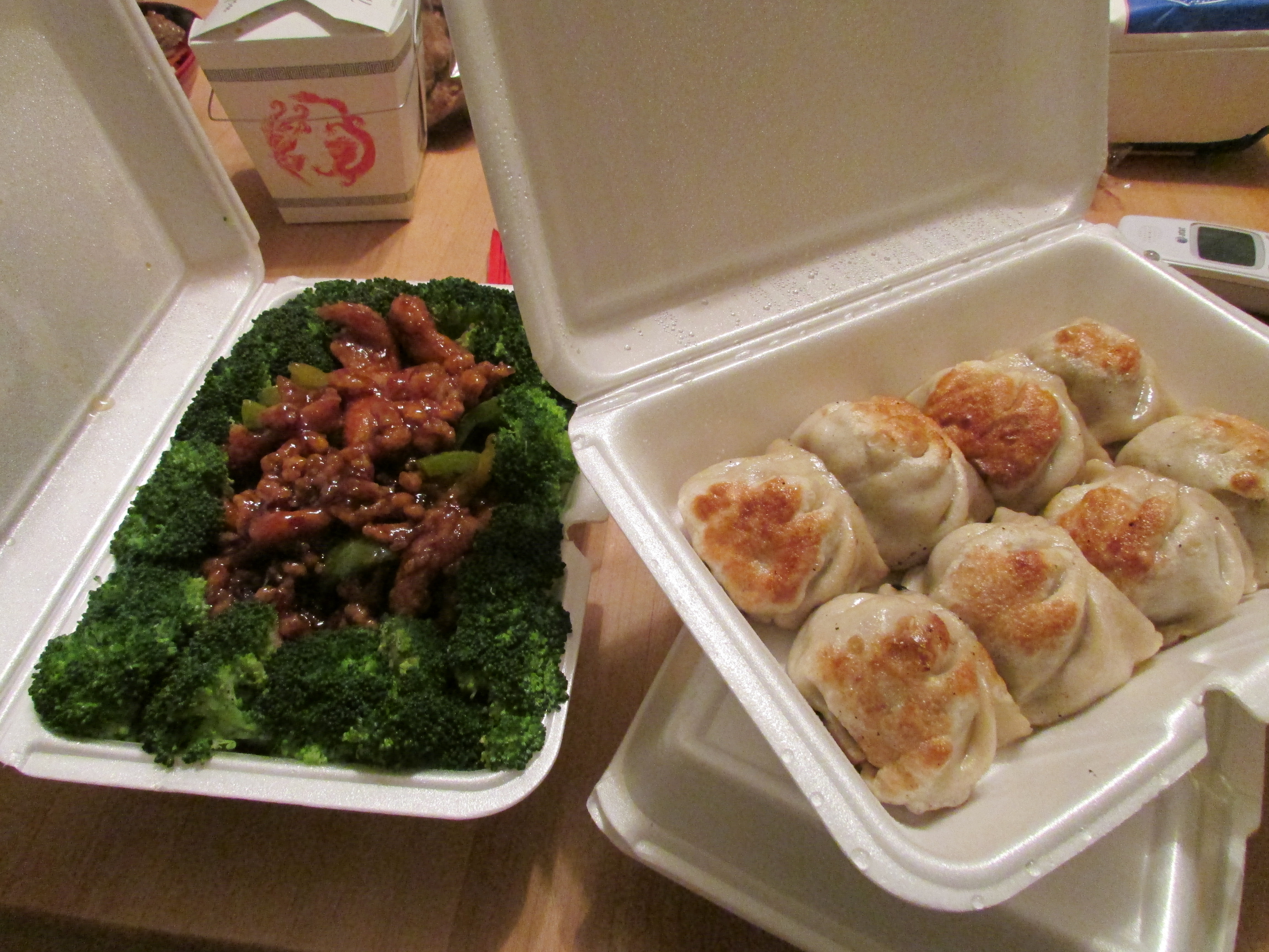 General Tso's Chicken and fried pork dumplings from Golden Chopstix.