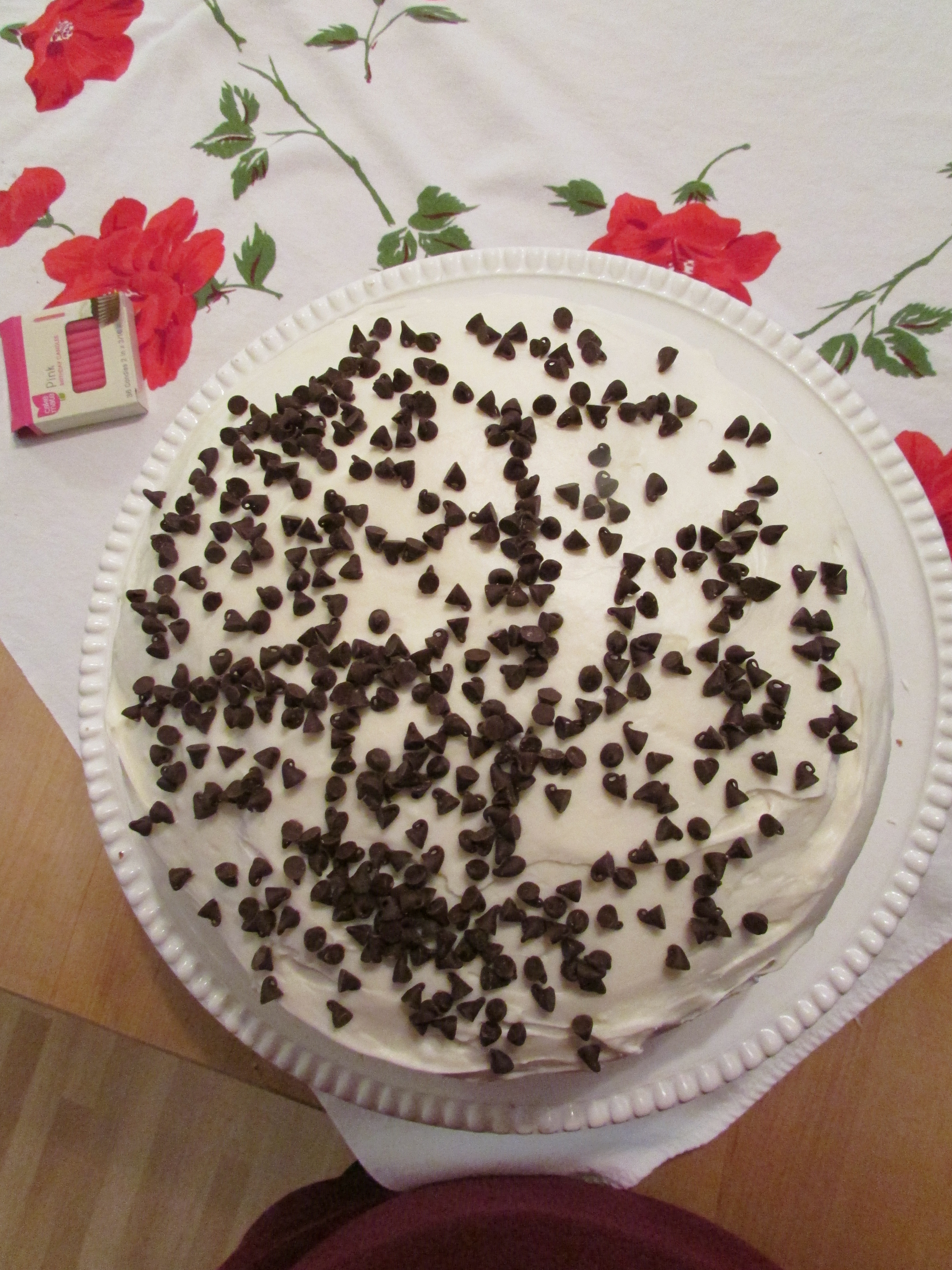 2015-03-28 003 I sprinkled mini chocolate chips on top of the one I made.  There were a few issues getting the cake layers out of their pans.  The broken cake layers had to be patched together with frosting.  I had to put the cake in the refrigerator and hope that the chilled frosting solidified enough so the cake didn’t fall apart and tumble off the stand.