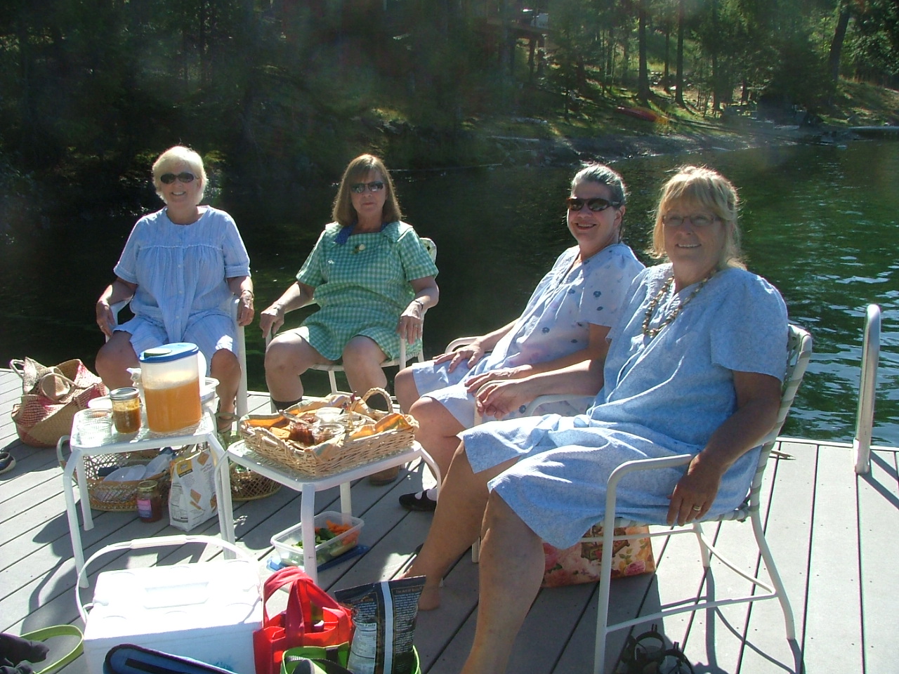 We skipped the Housedress Dress Code and the dock (it was close to 100 degrees, according to Accuweather) and set up lunch on the porch. Under the fan. With wine, vodka, tequila, iced tea and lots of food.