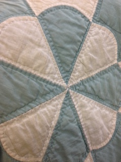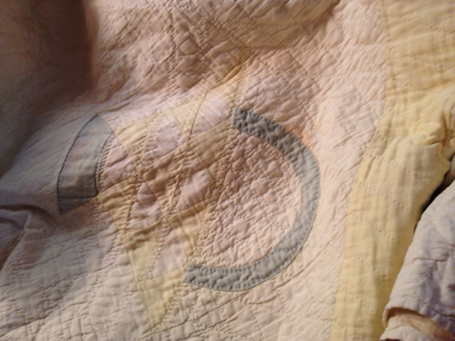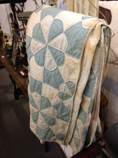 This quilt made me sad. It was beautifully hand stitched and hand quilted. But it was deeply stained. I hesitated over this for quite a while. I even went back to it and thought about it before I left the store without buying it. I wanted to honor the woman who made it–and what a beautiful seamstress she was–and yet the price stopped me. I wish I’d been a little braver about the stains and brought it home with me.