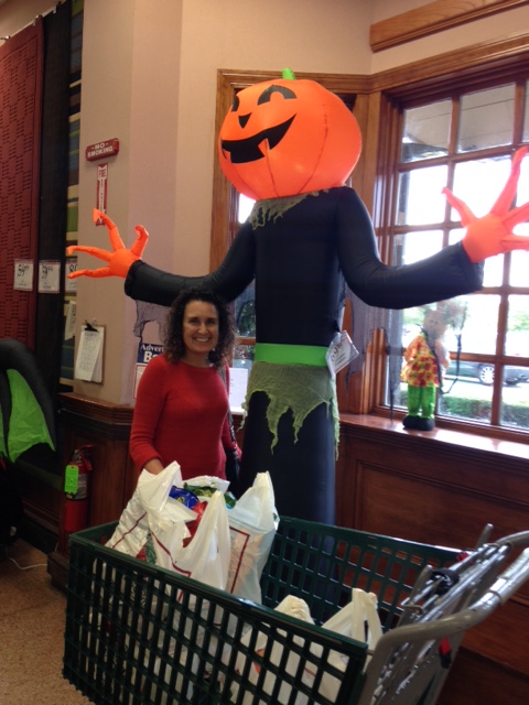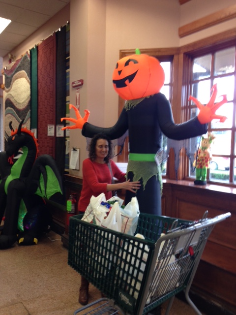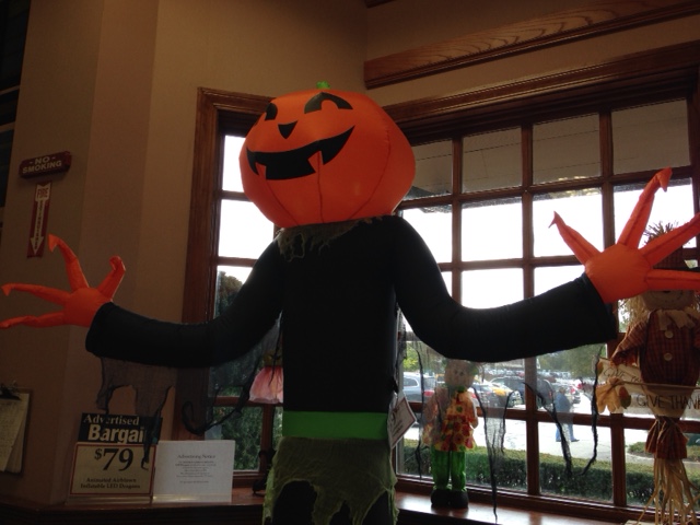 After buying lots of holiday paper goods and assorted bargains, I took a picture of the inflated scarecrow/pumpkin monster by the exit door while Harley Chick was paying for her purchases.