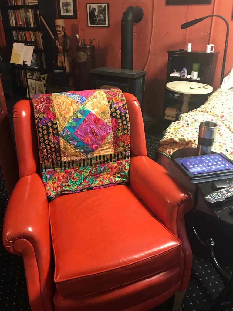 Eventually–if I wait long enough–my wild quilts land in the right places. This quilt was a particular favorite, as I made it from a Kaffe Fassett pattern and used the same (or almost the same) fabrics. I wanted to study his color and pattern choices so I could understand how to put fabrics together in pleasing ways. It was my own little class on how to use color successfully and it was quite an eye-opener.