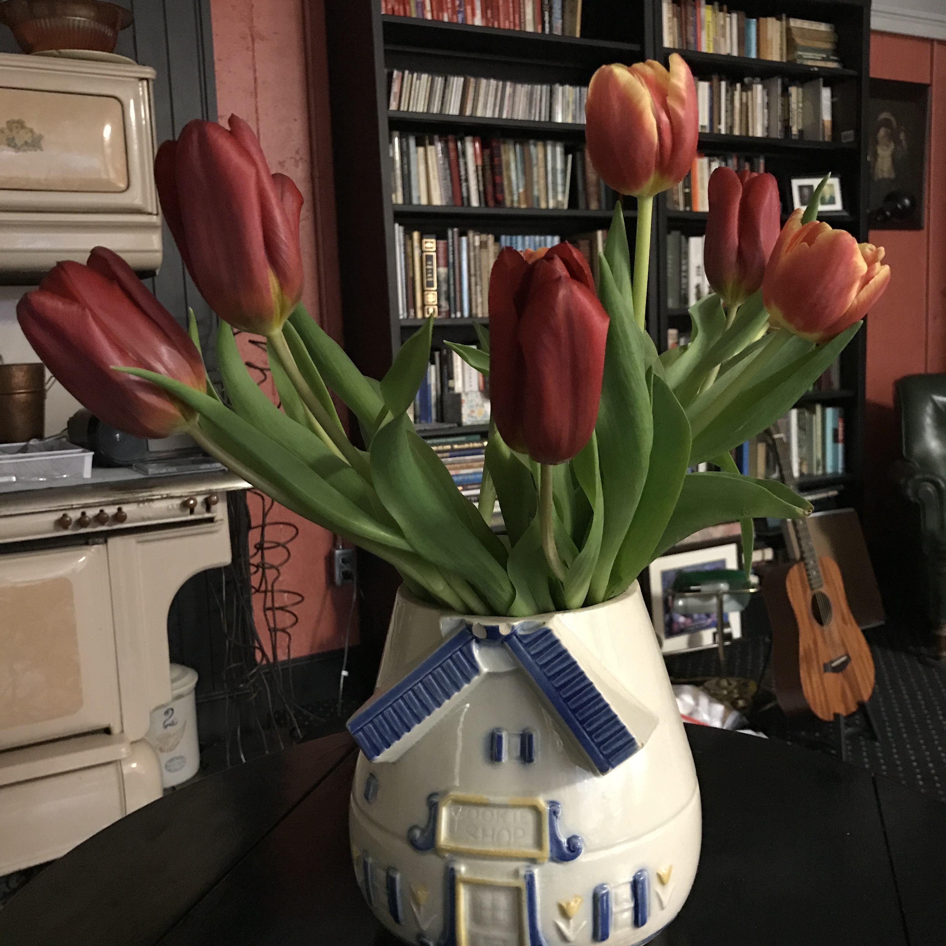 A gift from my friend Barbara, these tulips certainly brighten up the basement. I had no idea where the vases were packed, so I used the bottom half of my Dutch windmill cookie jar. Very appropriate!