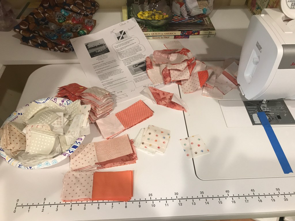 Yesterday I started sewing 480 squares onto 240 peach rectangles. Normally this kind of sewing would have me itching with boredom, but this is the last step in a 2017 Bonnie Hunter mystery quilt. It’s going to take a while to finish these.