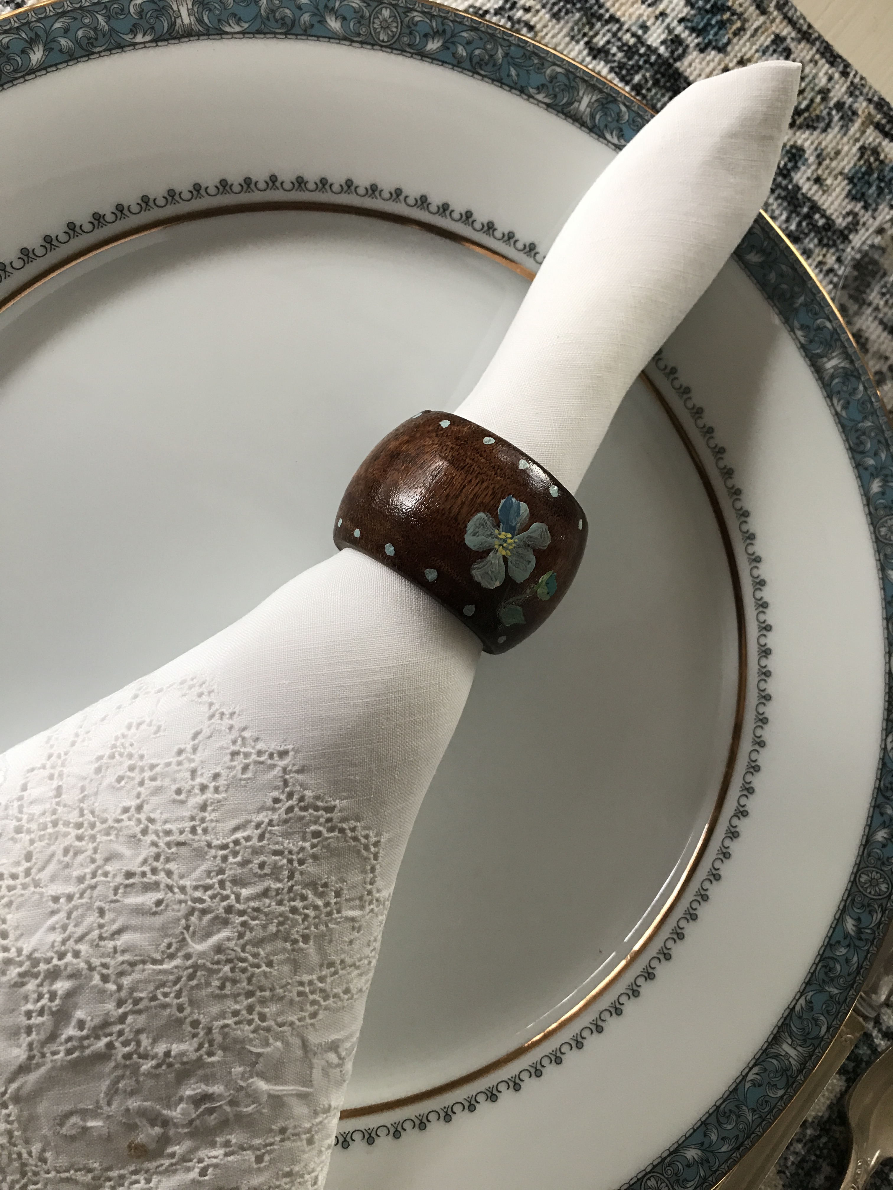 I was a bit sentimental when setting the table this year.   The china is our wedding china.  The napkin was a gift from a much-loved and missed friend who gave me her grandmother’s set of twelve one Christmas.  The napkin rings were my mother’s.  The water goblets from my grandmother.  The gold-trimmed wine glasses were wedding gifts.