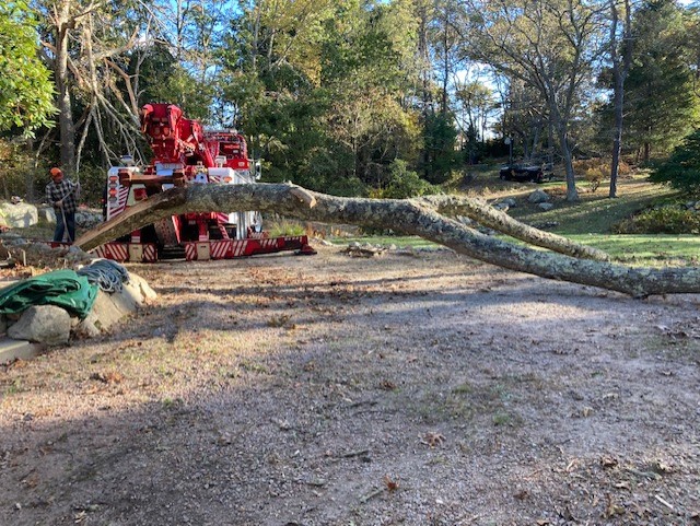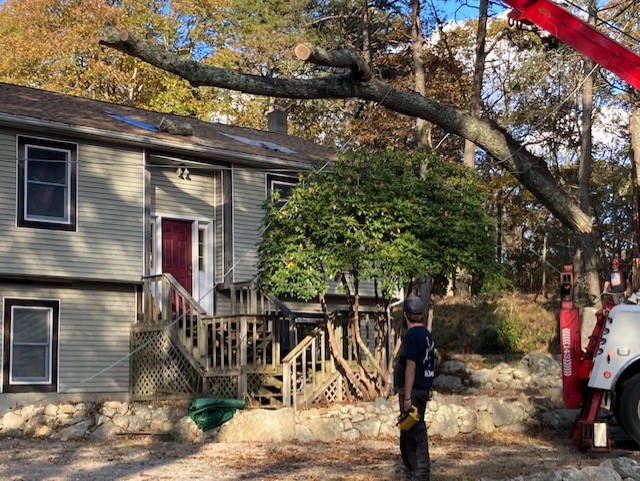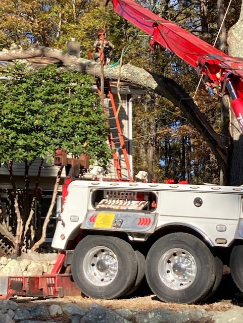 Bill, the tree removal expert, is on the left taking pictures as the giant limb is lifted into the air.