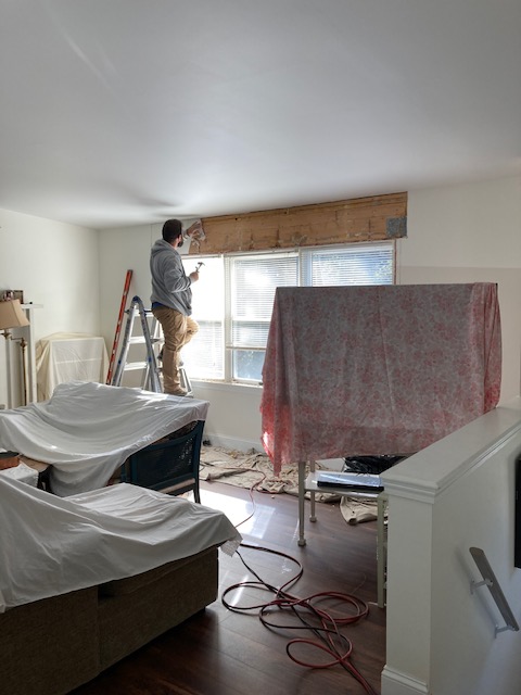 I might be repeating myself, but the crew arrived early Friday morning to replace rafters, secure the broken ridge and waterproof the roof. Saturday they returned to cover the hole in the entry hall and remove damp drywall above the living room windows.