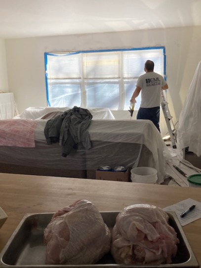 Walls are being primed while turkey is being brined.