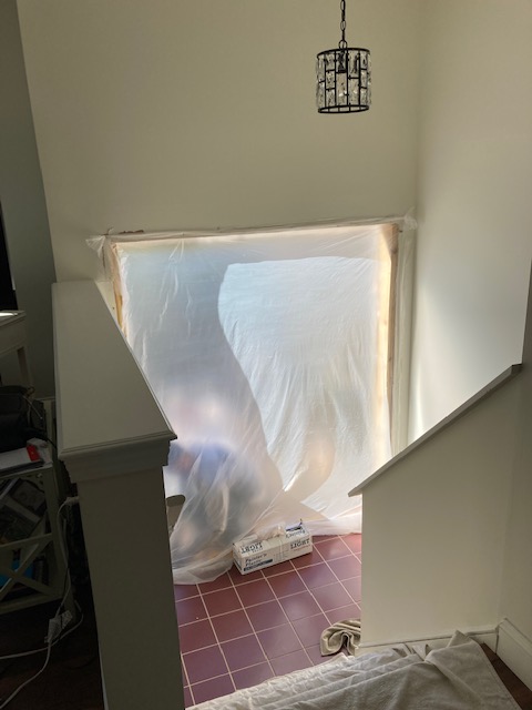 Our old, tree-damaged front door has been removed and a new one has been installed.