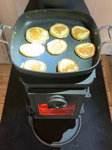 So this Pitcher To Hold The Pancake Spatula turned into Banjo Man’s birthday present. He’s thrilled. He built a shelf for it. The Funny Grandson painted the special vintage brackets to hold up the shelves.