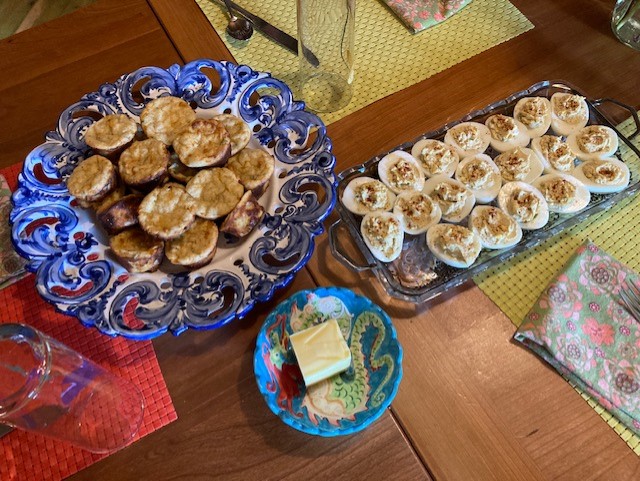 I tried a new recipe for my dessert contribution: French Custard Cake. The ingredients are put into a blender, mixed, then refrigerated for at least an hour but up to several days. I prepared the batter the night before, so the next morning all I had to do was slice the peaches (I wish I had used more than the recipe required), add the batter, sprinkle with sugar and bake.