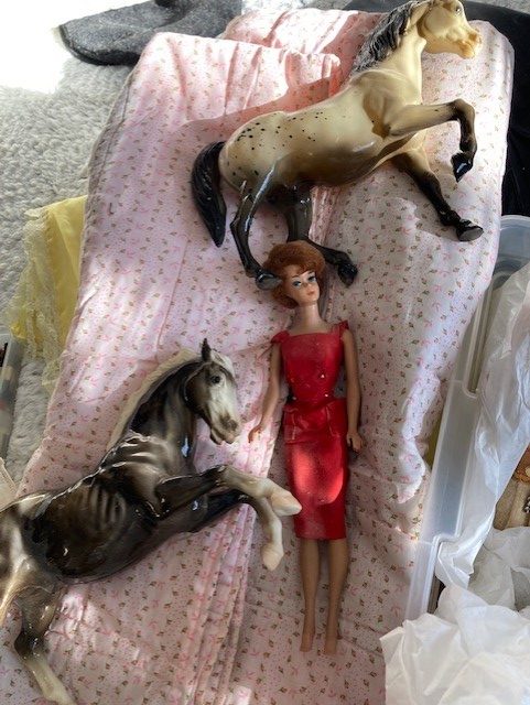Barbie and two Breyer horses were also in the box. Some of you might recognize this early Barbie (circa 1960-61). I sewed a lot of clothes for her out of scraps from my mother’s and grandmother’s sewing boxes. She was a good friend.