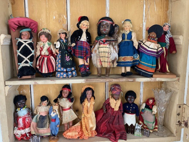 The collection of souvenir dolls was created by my Navy father, who bought them at various ports-of-call before I was born. Some of his Navy friends joined in, so for years the collection grew. From Hawaii to New Zealand, China to Israel, Italy to Mexico to Haiti and more. They hung from pink yarn on my bedroom wall.