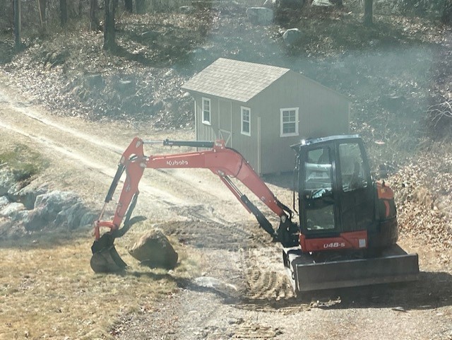 The neighbor with the back hoe had been building a stone staircase for my brother next door, so when it was finished Thursday afternoon he came over to dig out our rocks.