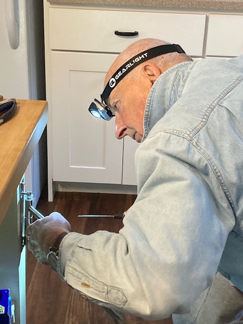 Banjo Man is using his birthday gift from daughter Nancy.  Don’t you love it?  Campers, hikers and hunters have been using them for years, but for household repairs?  It really helped.  I think we’re very, very late to the headlamp party here, but Banjo Man intends to use this light whenever he needs to see a little better.