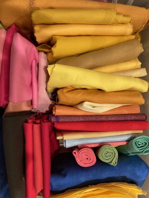 In my effort to design a star quilt, I’ve been searching through fabric in my closet. Here’s one container. Much of the pieces are leftovers from the Gingko quilt.