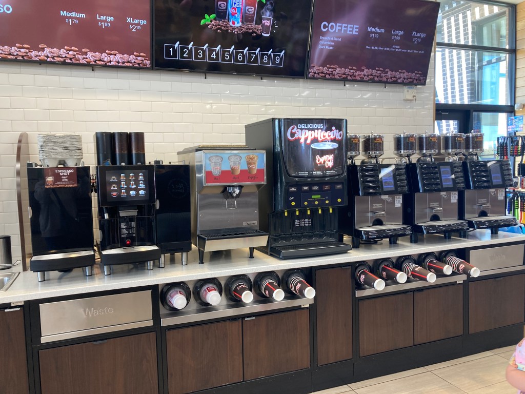 If you look closely you will see what looks like a very simple iced coffee dispenser. BUT…you must fill a plastic cup with ice and then the hot milk and espresso is poured over the ice, leaving a lukewarm drink that does not taste good at all.