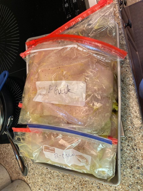 Trying out a new recipe by preparing sliced chicken breasts with marinade, then freezing them for future easy grilling. I hope it works. I’ll let you know.