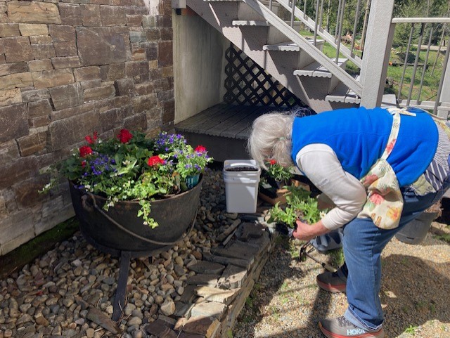 Dancing Mandolin Player gave me the beautiful gift of flowers in my mother-in-law’s old soap kettle yesterday. Isn’t it beautiful? I have planted various flowers in this pot all by myself, but the outcome was always…pitiful.