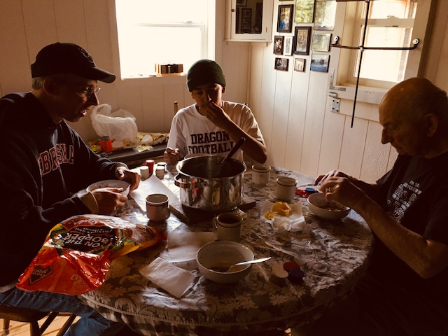Amber made beans (her specialty), I put together a macaroni and cheese casserole and Ben’s favorite banana cream pudding in a trifle dish. The guys eventually woke up and, recovered from “winter camping”, ate a grilled chicken dinner and played a few rounds of Mexican Train dominoes.