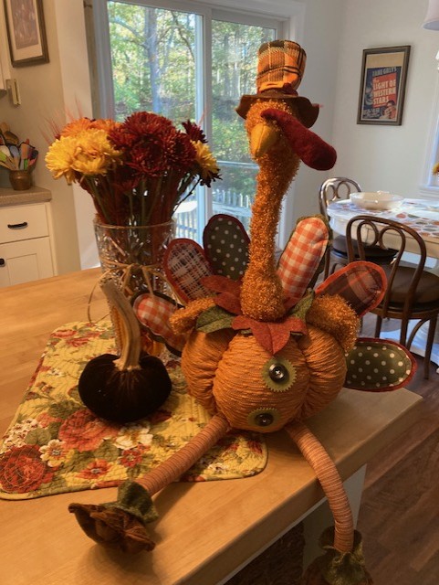 He makes me smile every time I look at him. I’ve moved him around the room and he looks good sitting on every surface. Where will he be Thanksgiving Day? I haven’t decided yet!